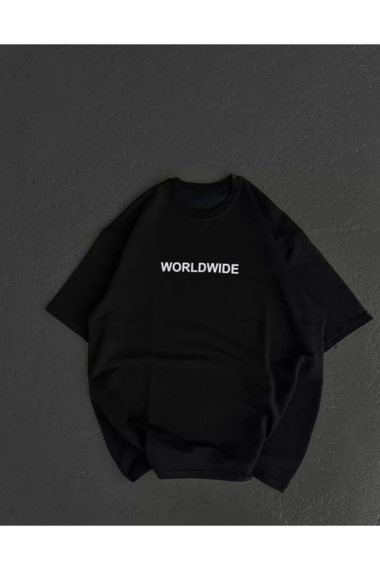 Unisex Bisiklet Yaka Baskılı Oversize T-Shirt - Siyah Modelin Ölçüleri: Boy:165, Kg:55, Göğüs:90, Bel:72, Kalça: 100 Modelin üzerindeki ürün M/38 bedendir