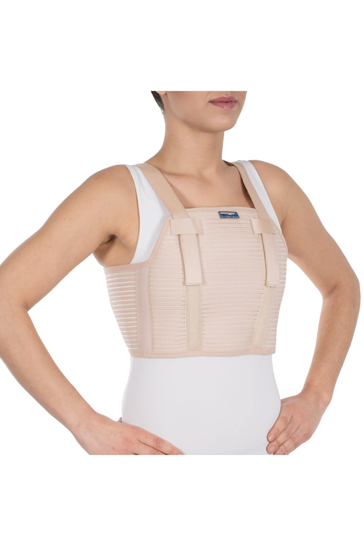 Göğüs korse (çelik balenli) Hava alabilen kumaştan üretilmiştir. ; Sternal bölgedeki çelik balenler göğüs kafesine kompresyon sağlayarak, sternumu destekler. ; Günlük hayatta hareket ile gelişen acı hissini azaltır. ; Ani hareket etmekten kaynaklanan ağrılara karşı koruma sağlanmasına yardımcı olur. ; [[[ Endikasyonlar ]]] O Kaburga kırıklarında O O Üst gövde stabilizasyonunda O O Göğüs kafesi cerrahisi sonrası rehabilitasyonda O;