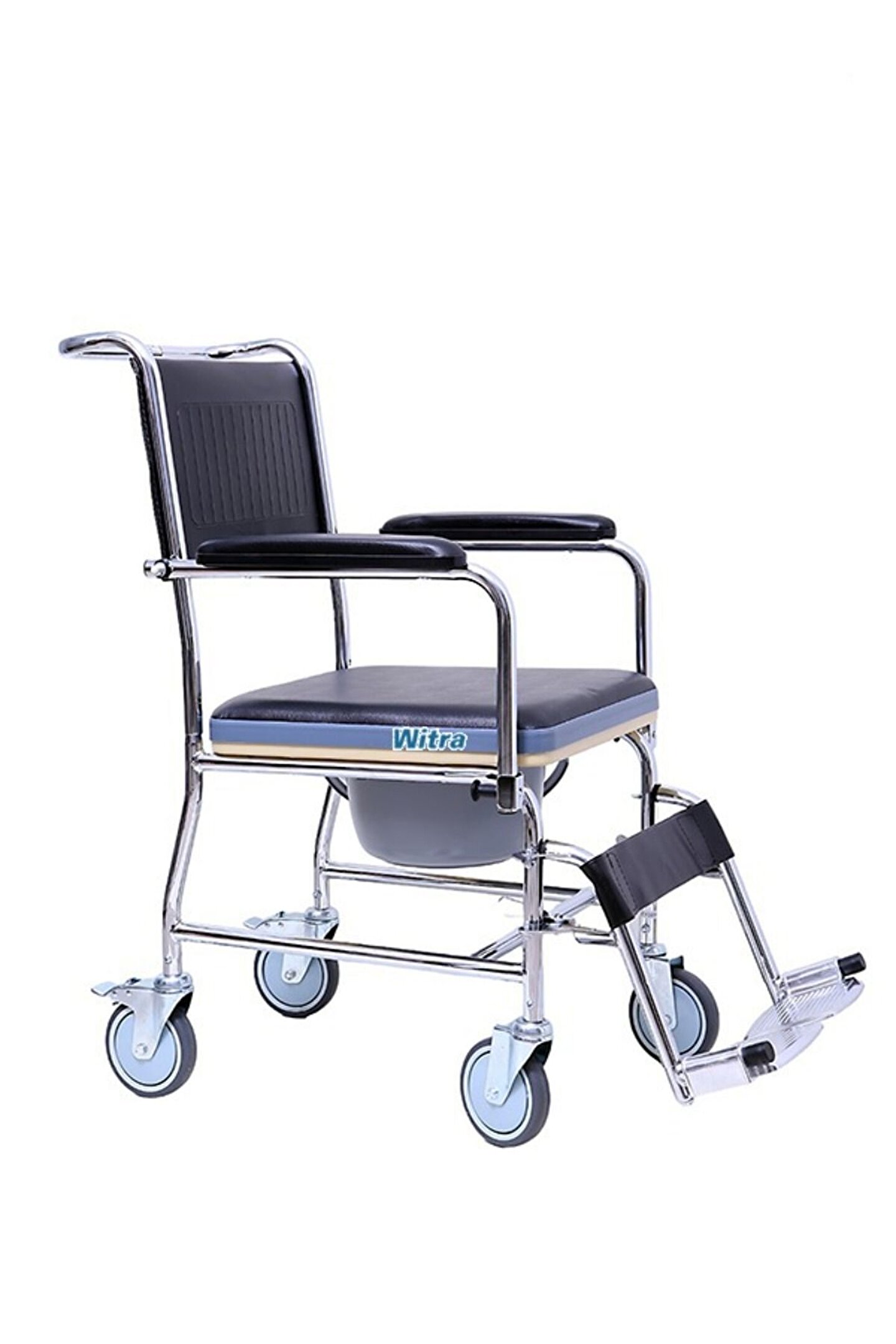 Banyo ve Tuvalet Sandalyesi Genel Özellikleri Witra lazımlıklı tekerlekli sandalye, çıkartılabilen ayaklıklara sahip olması sayesinde kullanıcı istediği takdirde ayaklıkları kolaylıkla çıkartıp takabilmekle beraber çıkarıldığında ekstradan depolamak için yer tasarrufu sağlar. Oturma yeri yüksekliği sayesinde, altındaki lazımlık çıkartılarak standart klozetlere yanaşma imkânı da sunan Witra banyo tuvalet sandalyesi, tekerleklerinin kilitlenmesine ve sandalyeyi sabitlemeye imkan vermektedir. mindere sahip olan Witra engelli tuvalet sandalyesi beraber oluşabilecek mantar, bakteri, istenmeyen koku problemlerini ortadan kaldırır. Paslanmaz şase ile suya karşı dayanıklı bir klozetli tekerlekli sandalye modeli olan Witranın lazımlık kısmı çok basit bir sürgülü sistemden oluşmaktadır ve kullanıcı veya refakatçi hiçbir zorluk çekmeden lazımlığı dilediği gibi takıp çıkarabilmektedir. Katlanabilir şase ; Çıkartılabilen ayaklıklar ; Hareketli kolçaklar ; Frenli sistem tekerlekler ; ve su geçirmez oturma minderi ; Paslanmaz şase ; Refakatçi kolları ;