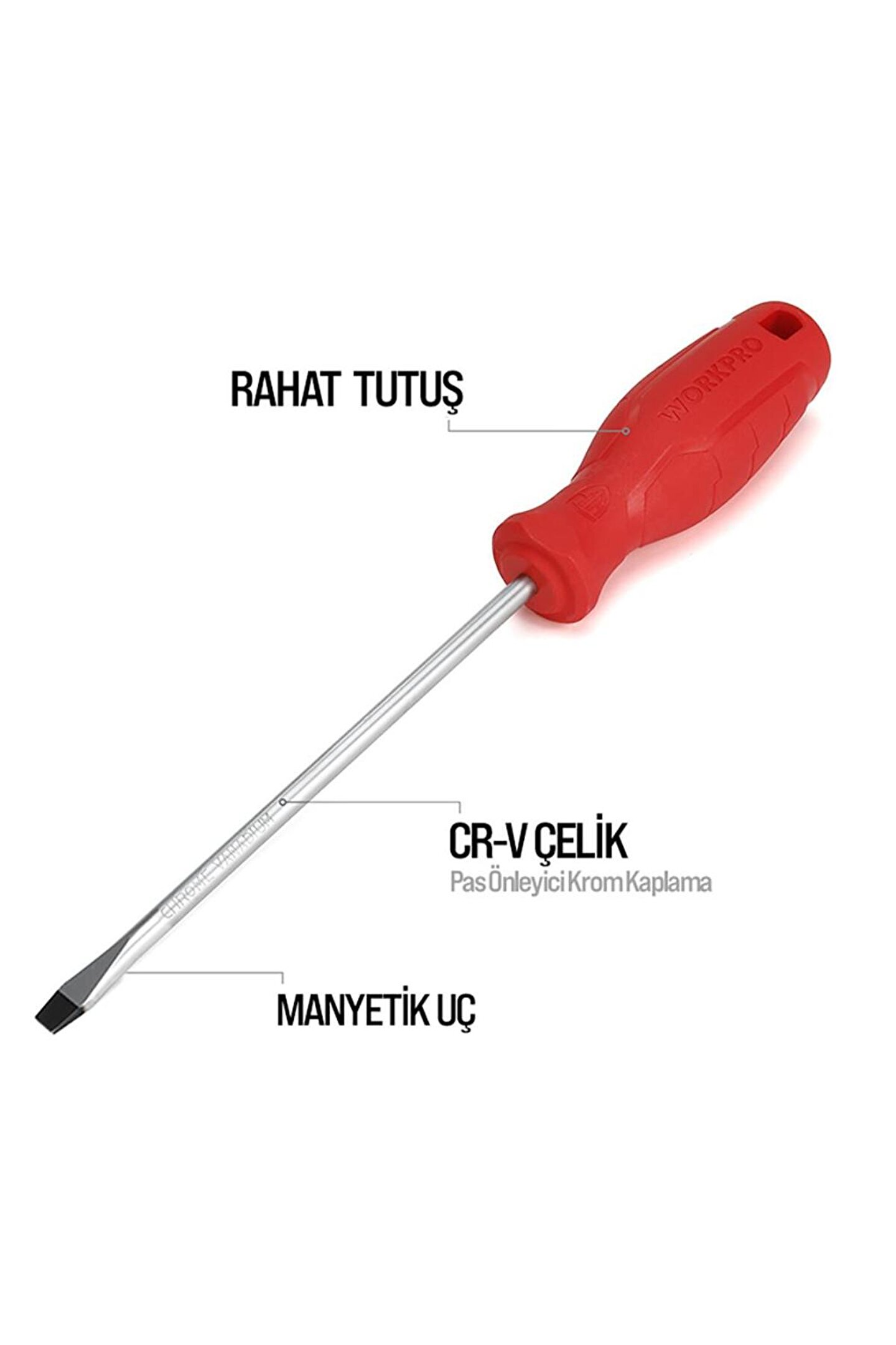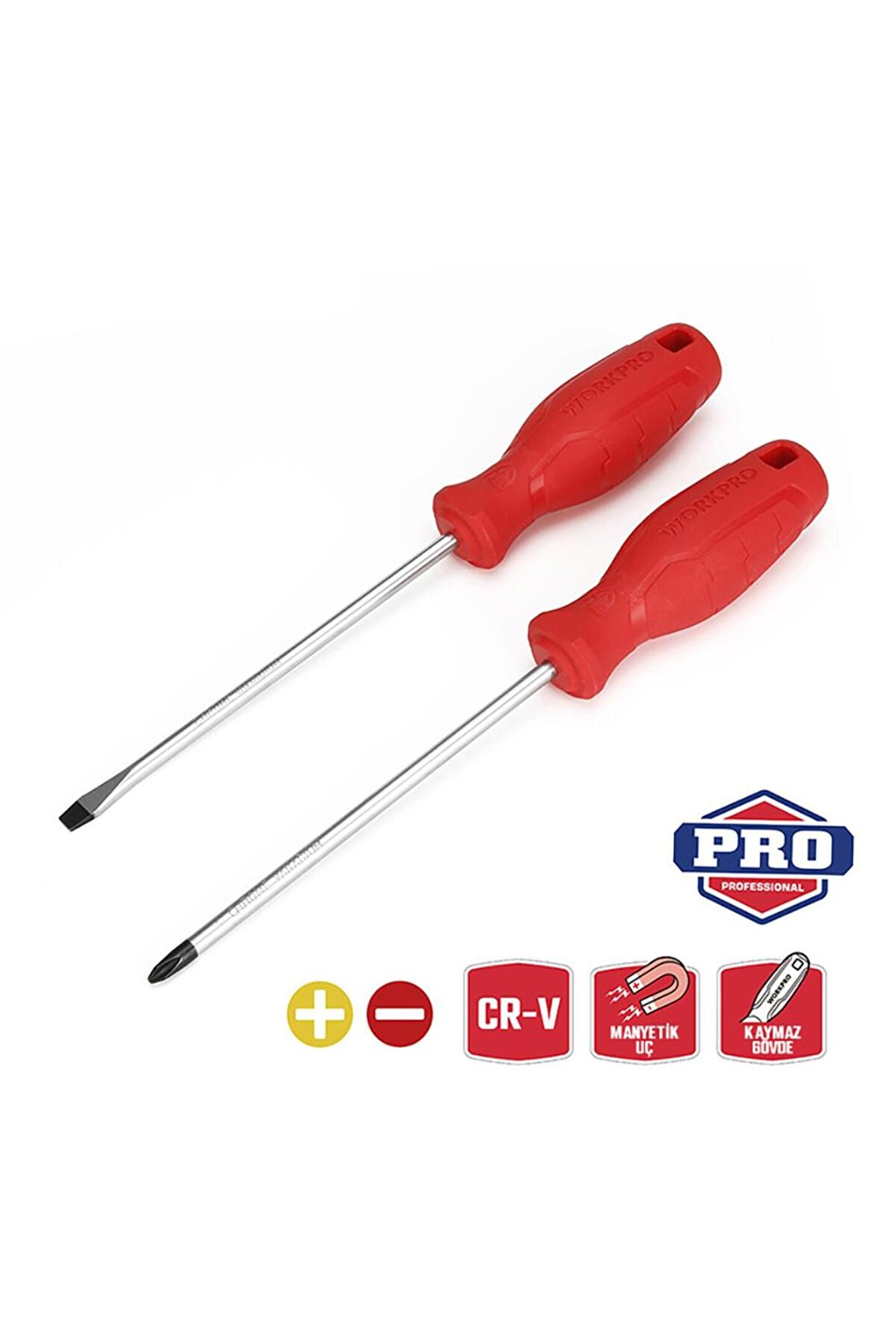 • WORKPRO WP200500 2 Parça Yıldız/Düz CR-V Manyetik Profesyonel Tornavida Seti • Mekanik veya elektrikli aletlerin bakım ve onarımında, profesyonel olarak kullanılabilmesi için paslanmaya ve aşınmaya dayanıklı Manyetik Krom Vanadyum vidalama uçlarına sahiptir.; • 1 Adet SL6.5x150mm DÜZ ve 1 Adet PH2x150mm YILDIZ Tornavidadan oluşan 2’li tornavida seti.; • Geliştirilmiş dayanıklılık, paslanma direnci ve korozyon önleyici özellik için ısıl işlem görmüş CR-V çelikten yapılmış 2 Parça Tornavida Seti.; • Geliştirilmiş güçlü, siyah manyetik uçlara sahip 2 Parçalı Tornavida Seti, dayanıklılık ve rahat kavrama sağlar.; • Tornavida setinin güçlü manyetik ucu, baş aşağı durumlarda bile vidanızı tutar.; Daha iyi kontrol sağlar.; • Rahat kullanım için ANTI-SLIP kaymayan, kolay kavranan tutma sapı sayesinde konforlu kullanım imkânı.; • Üst düzey ANTI-SLIP sap tasarımı kaymayı önler, el yorgunluğunu azaltır.; • Yüksek kaliteli CR-V çelik kullanılmıştır, hassas ve ısıl işlemden sonra vidalama uçları daha sert ve dayanıklı hale getirilmiştir.; • İÇERİK: 1 Adet SL6.5x150mm DÜZ, 1 Adet PH2x150mm YILDIZ Tornavida.;