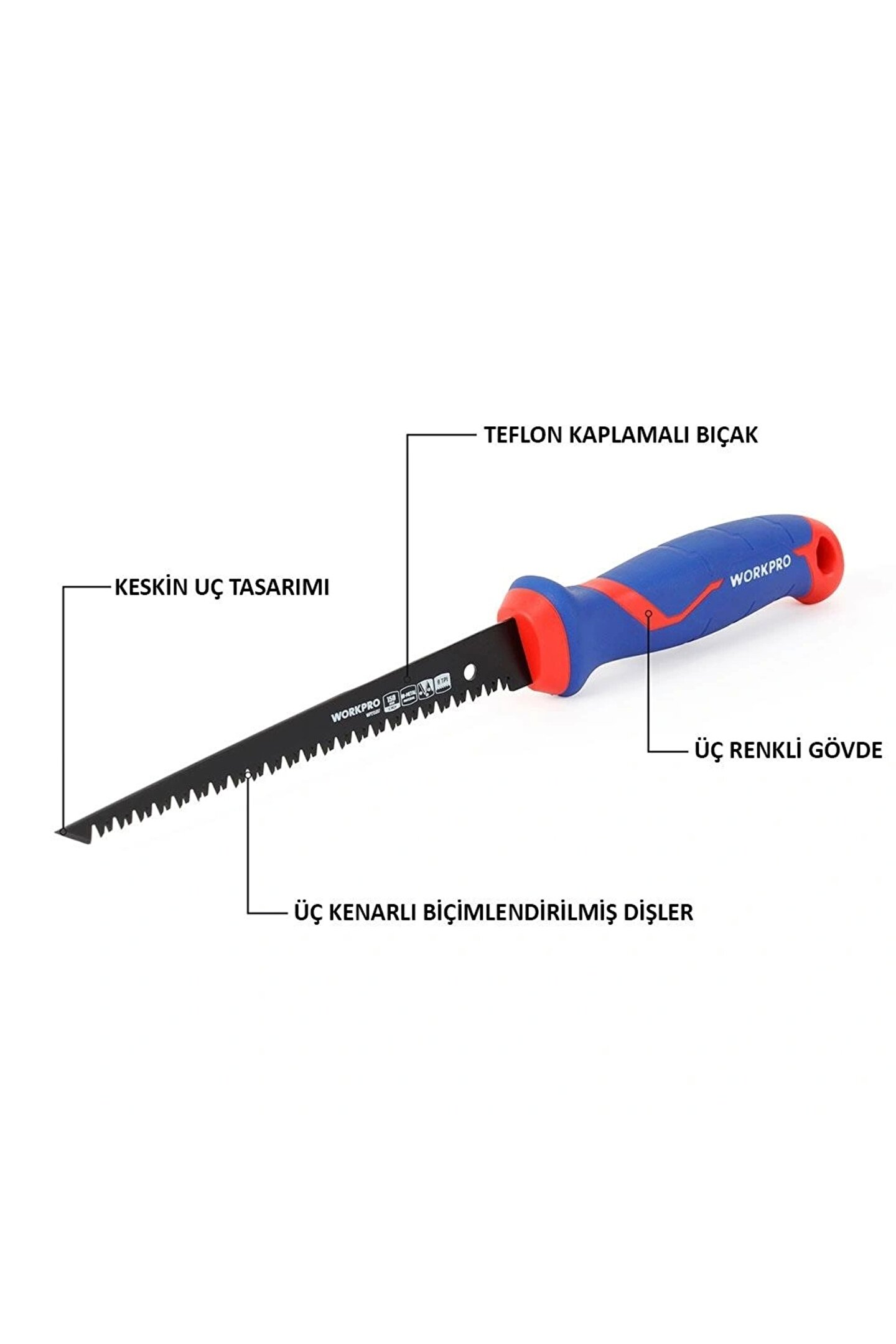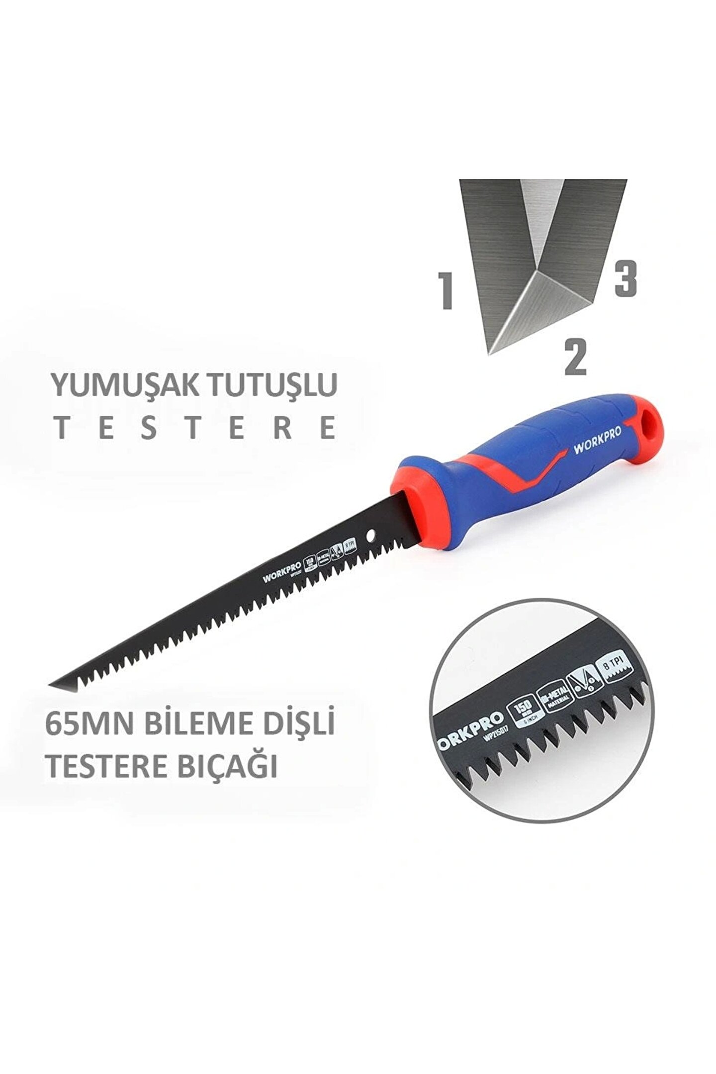 • WORKPRO WP215017 150mm Hızlı Kesim Profesyonel BI-METAL Alçıpan Testeresi • Alçıpan, İşlenmiş ahşap, kereste, yaş ve kuru ham ağaç, PVC, Bambu gibi yumuşak veya sert malzemelerin hızlı kesimi için BI-METAL yüksek sertlik ve keskinlikteki Çelik çapraz üç kenarlı diş tasarımı sayesinde daha hızlı kesim yapmanızı sağlar.; • 8 TPI ısıl işlem görmüş yüksek sertliğe sahip çapraz üç kenarlı diş tasarımı ve her iki yönü keskinleştirilmiş dişler sayesinde ileri ve geri hareketlerde kesim yaparak üç kat hızlı kesim yapmanızı sağlar.; • BI-METAL sertleştirilmiş dişler ile sert malzeme ve zorlu kesimlerde dahi üstün kesim performansı sağlar.; • Keskin sivri uç tasarımı sayesinde hızlı kesim sağlar, hizasından kaydırma yapmaz.; Malzeme yüzeyinde delik açmanızı sağlar.; • Hızlı ve kaliteli kesim için üç kenarlı kesici diş tasarımı sayesinde 3 kat daha uzun ömürlü yapıya, keskinliğe ve kesme hızına sahiptir.; • Patentli ANTI-SHOCK™ Avuç içini terletmeyen ve titreşim emici kauçuk kaplı tutma sapı sayesinde uzun süreli çalışmalarda avuç içine zarar vermez el ve bilek sağlığınızı korumanızı sağlar.; • WORKPRO, Amerika Birleşik Devletleri menşeli profesyonel bir El Aleti markası olup 1992 yılında kurulmuştur.; • WORKPRO, Dünyanın en büyük El Aleti üreticisidir ve Mekanik El Aletleri alanında dünya çapında 21 üretim üssüne sahiptir.; • WORKPRO, Dünya genelinde 5 AR-GE üssü ve inovasyon teknoloji merkezleri sayesinde, her yıl 400'den fazla yeni ürün geliştirmektedir.; Sektöründe 700'den fazla uluslararası patentin de sahibidir.; • WORKPRO, Sadece profesyonel değil, aynı zamanda Rekabetçi Fiyat, Yüksek Kalite ve Geniş Ürün Çeşidiyle Dünya çapında 100’den fazla ülkede hizmet vermektedir.