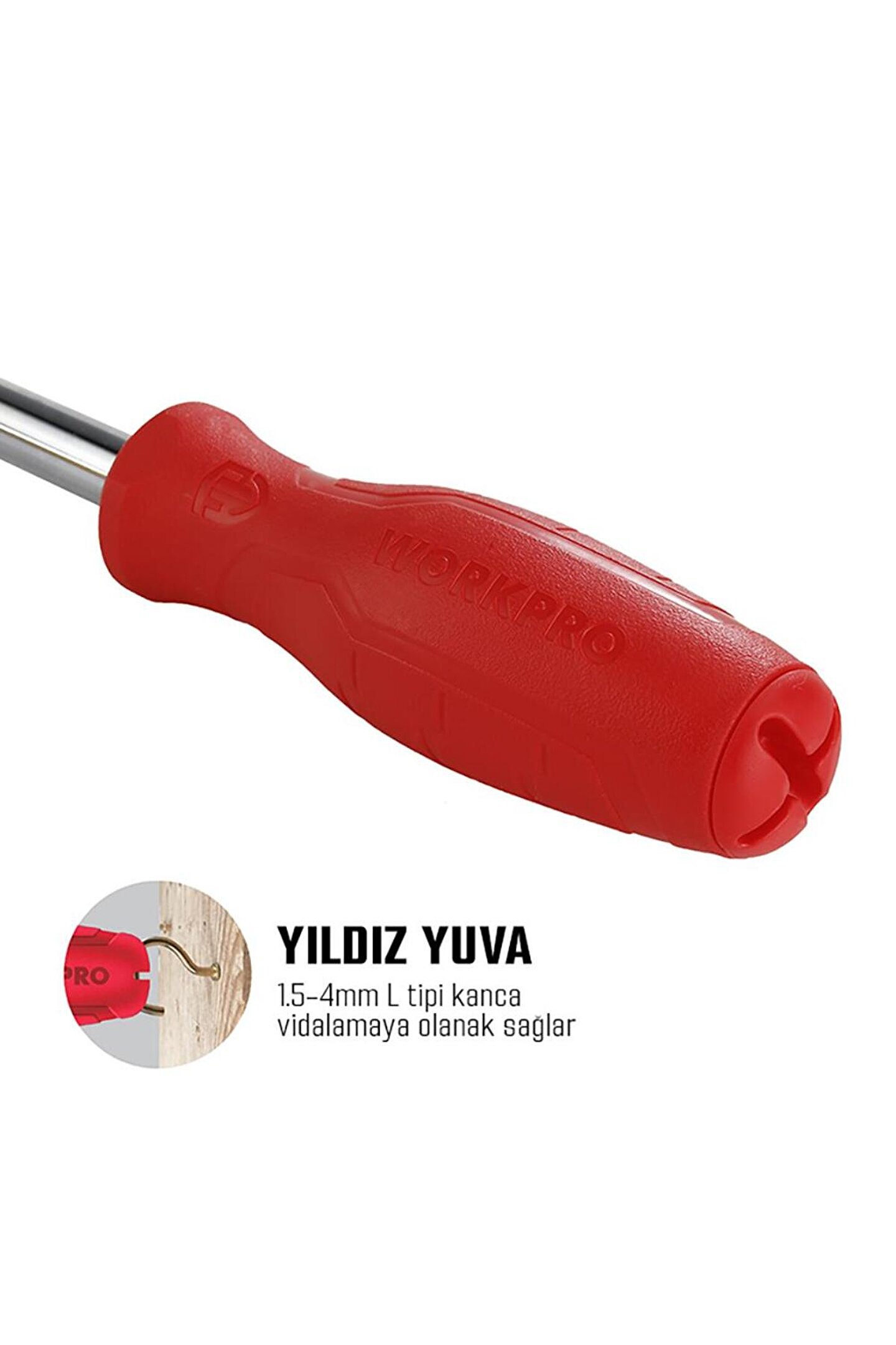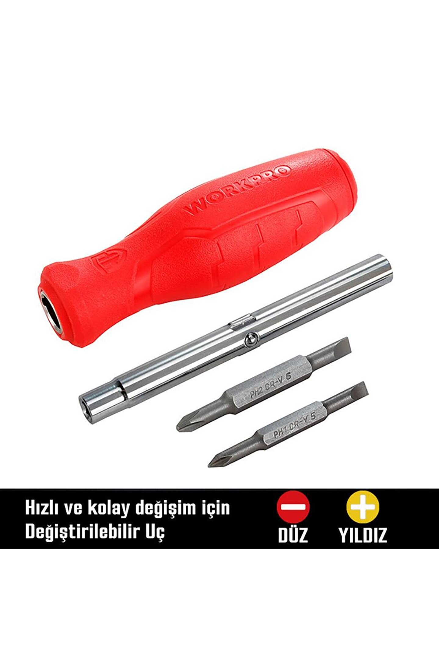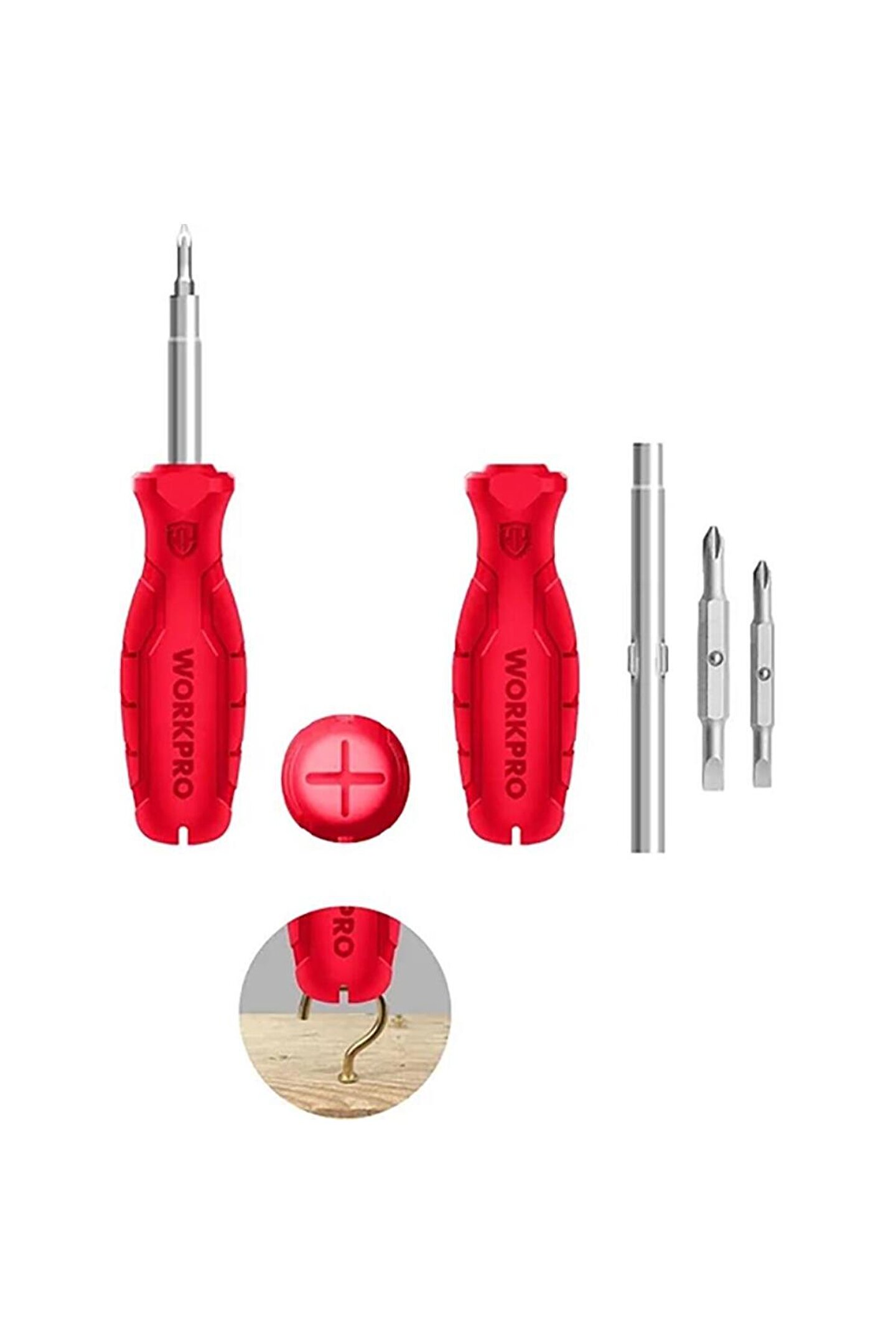 • WORKPRO WP221066 6-IN-1 Çok Fonksiyonlu Değişken Uçlu Profesyonel Tornavida Seti • Mekanik veya elektrikli aletlerin bakım ve onarımında, profesyonel olarak kullanılabilmesi için paslanmaya ve aşınmaya dayanıklı Krom Vanadyum vidalama uçlarına sahiptir.; • İki yönlü 2 adet bits uç ve toplamda 4 farklı yıldız ve düz vidalama ucu sayesinde her iki yönde bulunan vidalama bits uçları ile çok yönlü kullanım imkânı.; • Tutma sapının arkası ile 1,5mm-4mm kadar açık piton kancalar, Allen ve T anahtarların şeklini alarak kolay montaj yapmanızı sağlar.; • Üst düzey ANTI SLİP sap tasarımı kaymayı önler, el yorgunluğunu azaltır.; • Yüksek kaliteli CR-V çelik kullanılmıştır, hassas ve ısıl işlemden sonra vidalama uçları daha sert ve dayanıklı hale getirilmiştir.; • Güçlü manyetik ucu, baş aşağı durumlarda bile vidanızı tutar.; Daha iyi kontrol sağlar.; • İÇERİK: 2 Yönlü PH2/SL6- 2 Yönlü PH1/SL5 Vidalama Bits Uçlar.;