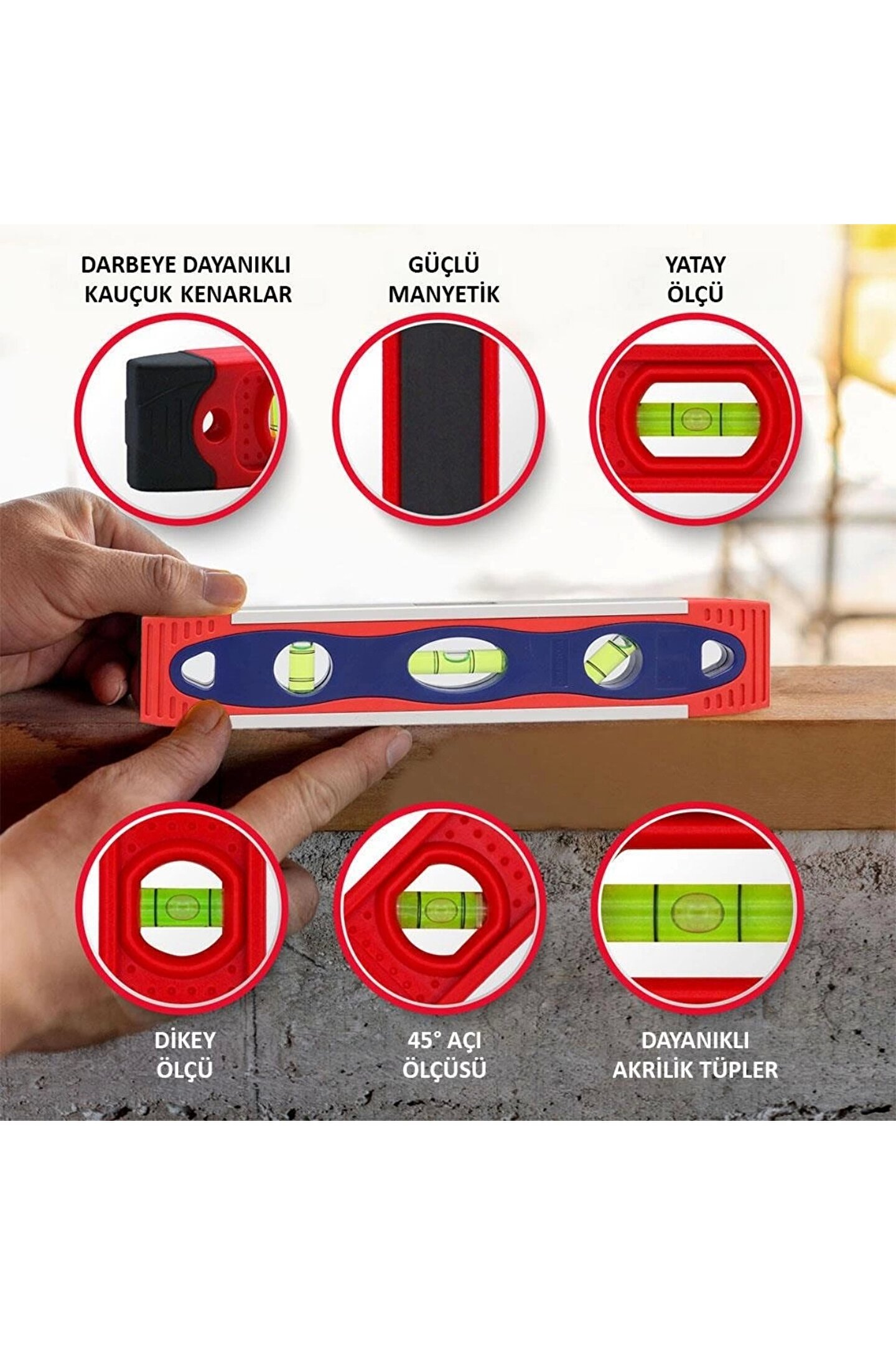 • WORKPRO WP262027 225MM Manyetik Şoka Dayanıklı Torpedo Su Terazisi • 22,5cm manyetik yüzeyi sayesinde metal yüzeylerde, dar alanlarda, tablo asma işlerinde, raf montajlarında ve fabrika makina kurulumlarında kolay ve rahat kullanım sağlar.; • Hassas hizalama gerektiren tüm işlerde kullanılabilmesi için üç farklı açıda yerleştirilmiş su terazi ampulleri sayesinde açılı nesnelerin hizalanmasında kullanıma uygundur.; • Hem yatay hem dikey ve hem de 45˚lik açılı yüzeylerde terazi ayarı yapabilmek ve kontrol edebilmek için konumlandırılmış üç farklı su terazi ampulü.; • Manyetik şerit sayesinde metal yüzeylerde kolay ve güçlü yapışma özelliği sayesinde pratik kullanım.; • V oluklu yüzey, silindirik yüzeyli boru ve kablo gibi yüzeylere tam temas etmesini sağlar.; Bu sayede en doğru hizalamayı yapmanızı sağlar.; • Ağır hizmet tipi Alüminyum çerçeve sayesinde sağlam yapı.; • Her iki yönde bulunan şok emici kauçuk destekler sayesinde uzun ömürlü kullanım.; • WORKPRO, Amerika Birleşik Devletleri menşeli profesyonel bir El Aleti markası olup 1992 yılında kurulmuştur.; • WORKPRO, Dünyanın en büyük El Aleti üreticisidir ve Mekanik El Aletleri alanında dünya çapında 21 üretim üssüne sahiptir.; • WORKPRO, Dünya genelinde 5 AR-GE üssü ve inovasyon teknoloji merkezleri sayesinde, her yıl 400'den fazla yeni ürün geliştirmektedir.; Sektöründe 700'den fazla uluslararası patentin de sahibidir.; • WORKPRO, Sadece profesyonel değil, aynı zamanda Rekabetçi Fiyat, Yüksek Kalite ve Geniş Ürün Çeşidiyle Dünya çapında 100’den fazla ülkede hizmet vermektedir
