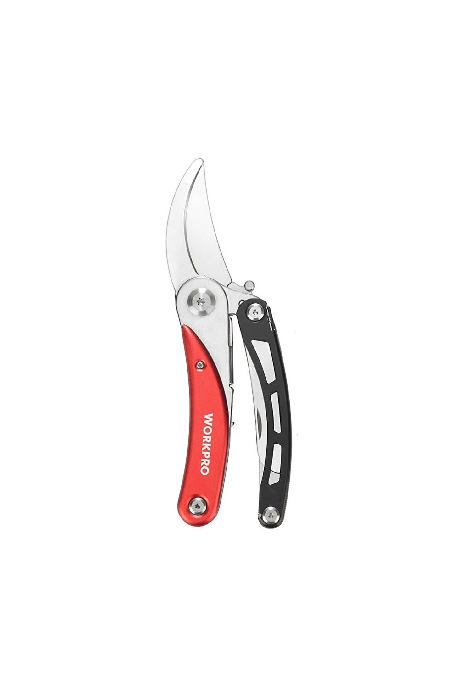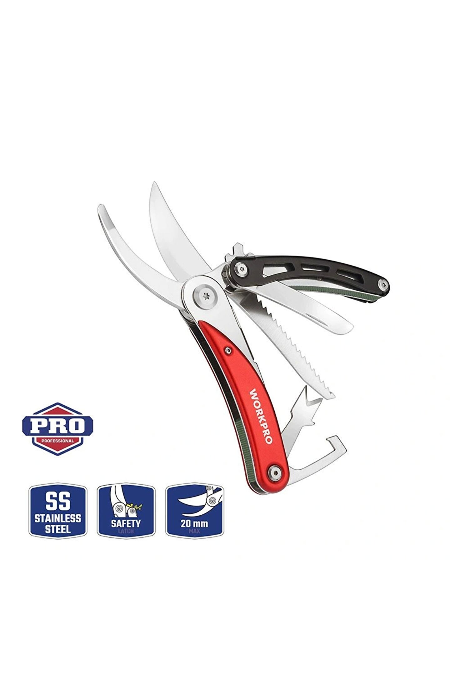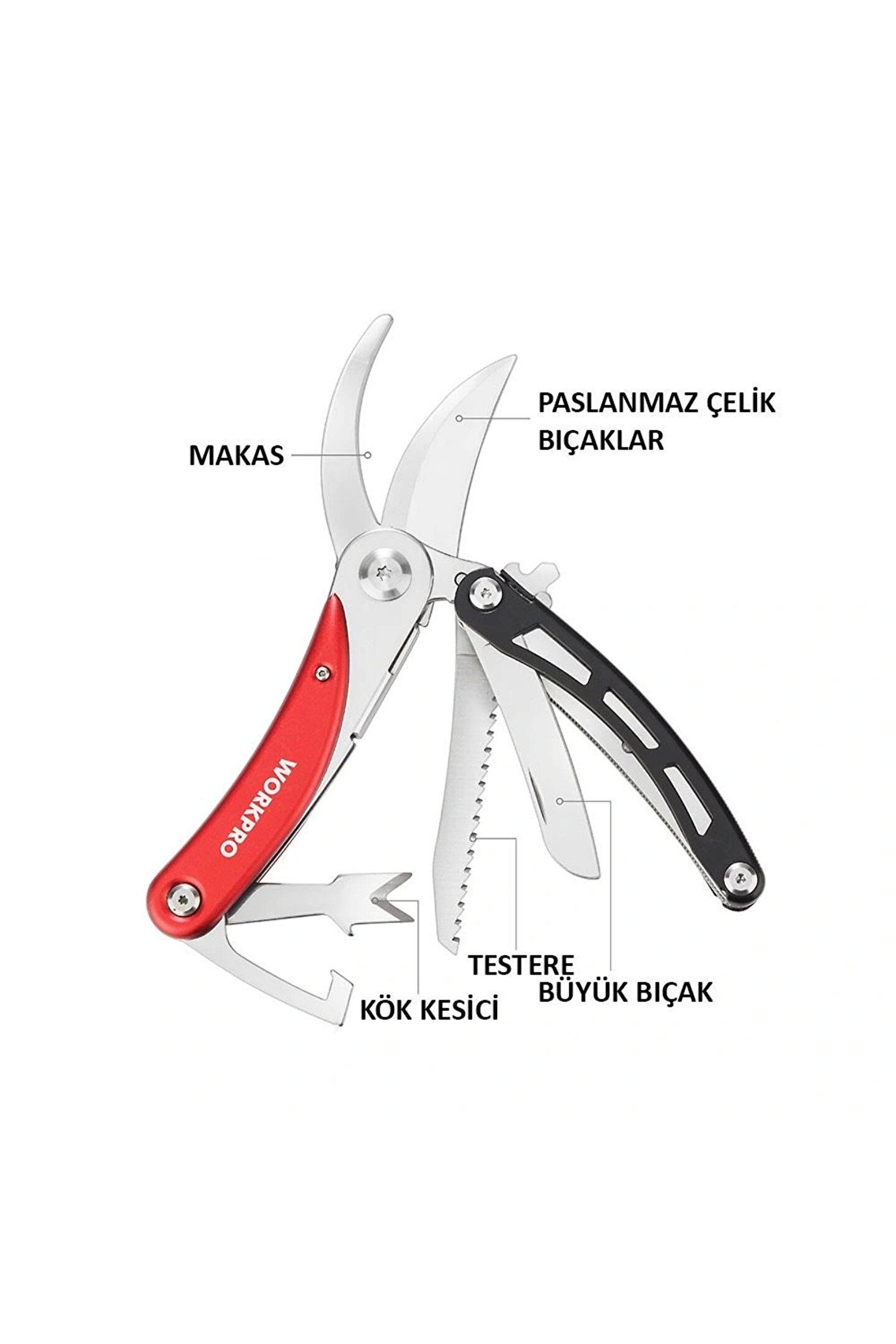 • WORKPRO WP382005 4 IN 1 Çok Fonksiyonlu Bağ Bahçe Dal Budama Makası • Maksimum 20mm çapındaki dalların, üzüm bağı, meyve ağacı, genel ağaç dalı, sert dallara sahip çiçekler ve peyzaj düzenlemelerinde uzun ömürlü kullanılabilmesi için paslanma ve aşınmaya karşı dayanıklı paslanmaz çelik bıçak ve gövdeden üretilmiştir.; • Budama makası, dal budama testeresi, bıçak, kök kesici, kanca gibi birçok kullanım alanı sayesinde tek bir alet ile 4 farklı kullanım sağlar.; • Alüminyum çerçeveli dayanıklı paslanmaz dövme çelikten üretilmiş uzun ömürlü sağlam yapı.; • Yüksek kaliteli paslanmaz dövme çelik kullanılmıştır, hassas ve ısıl işlemden sonra kesici budama makası ve testere dişleri daha sert ve dayanıklı hale getirilmiştir.; • Kilitlenebilir katlanır fonksiyonel aksesuarlar ile güvenli kullanım imkânı.; • Açılır kapanır özel menteşeli yapısı ile portatif ve çok amaçlı kullanım sağlar.; • WORKPRO, Amerika Birleşik Devletleri menşeli profesyonel bir El Aleti markası olup 1992 yılında kurulmuştur.; • WORKPRO, Dünyanın en büyük El Aleti üreticisidir ve Mekanik El Aletleri alanında dünya çapında 21 üretim üssüne sahiptir.; • WORKPRO, Dünya genelinde 5 AR-GE üssü ve inovasyon teknoloji merkezleri sayesinde, her yıl 400'den fazla yeni ürün geliştirmektedir.; Sektöründe 700'den fazla uluslararası patentin de sahibidir.; • WORKPRO, Sadece profesyonel değil, aynı zamanda Rekabetçi Fiyat, Yüksek Kalite ve Geniş Ürün Çeşidiyle Dünya çapında 100’den fazla ülkede hizmet vermektedir.
