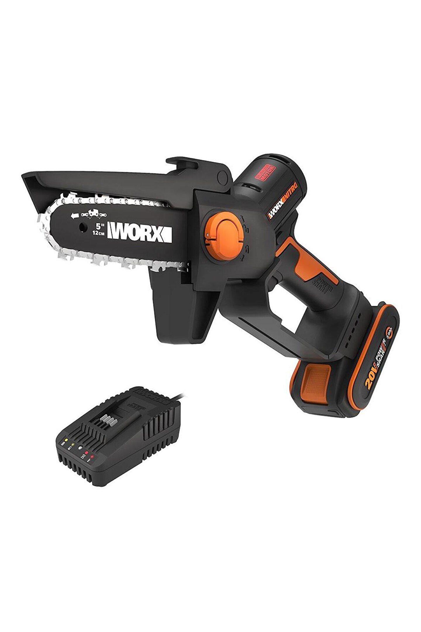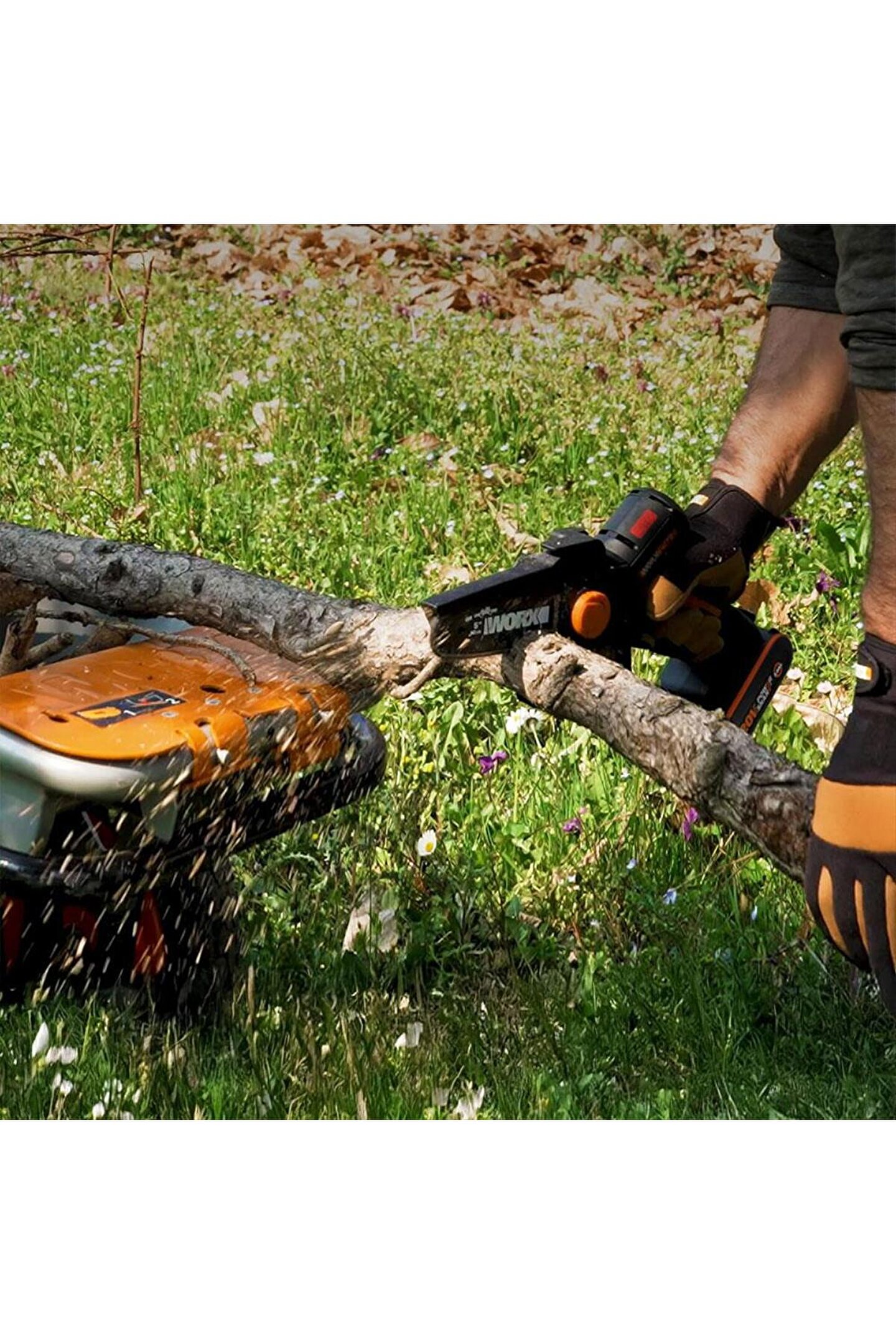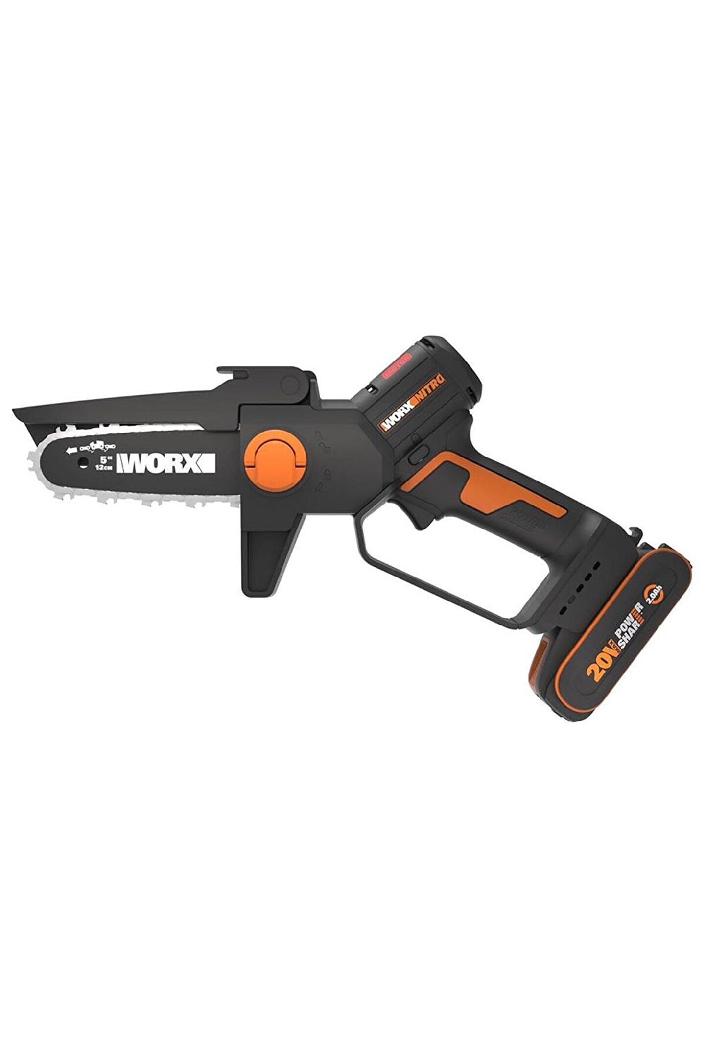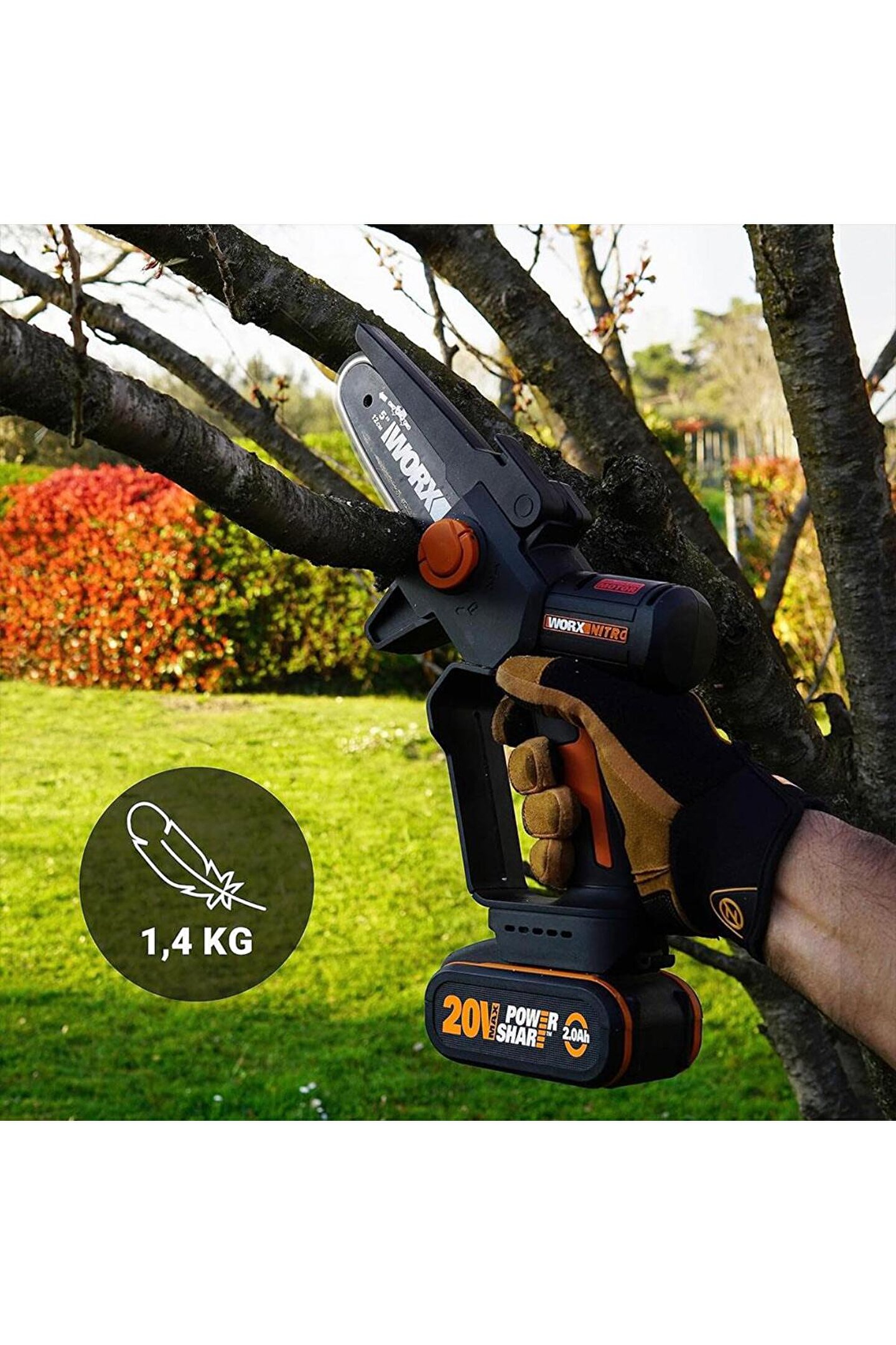 · WORX WG325E 20Volt 2.0Ah Li-ion 12CM Profesyonel Şarjlı Kömürsüz Zincirli Testere · 20Volt Li-ion akü ve kömürsüz motor teknolojisi ile rakiplerinden daha güçlü ve yüksek performans sağlar.; · 12cm pala uzunluğu, zincir üzerindeki 14 adet keskin elmas dişler ve sağlam dişli yapısı ile kalas kesme, ağaç ve dal budama, peyzaj düzenlemeleri gibi en zorlu işlerde kullanım için uygundur.; · Entegre 30ml.; Zincir yağlama deposu ile zincir sürekli yağlanarak uzun süre kesim yapmanızı ve daha az zincir bakımı yapmanızı sağlar.; · Son derece kompakt ve hafif, yorulmadan uzun süre kesim yapmanızı sağlar.; · 20Volt güçlü motor, 12cm pala boyu ve yüksek mukavemetli dişli mekanizması sayesinde her türlü ahşap malzemede üstün kesme performansı sağlar.; · Worx NITRO serisi, Profesyonel ve ağır hizmet tipi uygulamalar için tasarlanmış teknolojik donanımları en üst seviyede olan ürünlerdir.; · 5650 dev/dk.; devir hızı ve 10m/sn.; zincir dönüş hareketi ile hızlı, kaliteli ve mükemmel kesim kalitesi sağlar.; · Çapraz yönlü Elmas bıçaklar titreşimi engeller, mükemmel kesim kalitesi sağlayarak ağaçları, dalları daha simetrik bir şekilde kesmenizi ve budamanızı sağlar.; · Anahtarsız zincir değiştirme özelliği sayesinde hızlı ve kolay zincir değiştirme imkânı.; · TOOL-LESS Anahtarsız aksesuar değiştirme özelliği, zinciri hızlı ve güvenli şekilde takmanızı, değiştirmenizi ve bakım yapmanızı sağlar.; · Motor fireni sayesinde tetikten parmak çekildiği anda zincir hızlı bir şekilde durur, bu sayede kullanıcı, malzeme ve makine güvenliği sağlanır.; · Anti-Vibrasyon, titreşim engelleme teknolojisi sayesinde, karşı denge mekanizmasıyla neredeyse sıfır titreşim sağlayarak kesme esnasında hassas ve konforlu çalışmanızı sağlar.; · Kıymıksız ve temiz kesim için LASER CUT teknolojisi ile üretilmiş özel çift yönlü Elmas dişler sayesinde 12cm çapa kadar ağaç, tahta ve dalların kesilmesinde maksimum performans sağlar.; · Ergonomik tasarım sayesinde ağırlığı akü ve tutma kolu arasında dengeli olarak dağıtır, dengeli ve güvenli tutuş sağlayarak yorulmadan uzun süre çalışma imkânı sağlar.; · Emniyet mandalı sayesinde tetik güvenliğe alınarak kullanıcı güvenliği sağlar.; · Geniş tutamak tasarım ile sıçrayan parçalara karşı El ve bilek güvenliği sağlar.; · Açılıp kapanabilir yaylı zincir koruma aparatı kesim esnasında maksimum güvenlik sağlar.; · Rahat kullanım için titreşimi emen kauçuk kaplı tutma gövdesi ile kolay kavrama ve rahat tutuş konforu sayesinde daha uzun süre çalışabilme imkânı sağlar.; · Olağan üstü kompakt ve hafif, uzun süre yorulmadan çalışma imkânı sağlar.; · Akü üzerinde yer alan akü şarj seviyesini gösteren 5 kademeli LED lamba sayesinde akü enerji seviyesini görebilme imkânı.; · Worx 20Volt Li-ion akü kullanılmadığı zamanda şarjını korur, bu sayede istediğiniz an kullanıma hazırdır.; · 1 saatlik hızlı şarj aleti ile kesintisiz çalışma imkânı.; · Haricen satın alınan WA4301 Alüminyum uzatma aparatı ile yüksek dalların budanmasında yardımcı olur.; · Profesyonel Kullanıma uygundur.; · Güç: 20Volt Li-ion · Akü Kapasitesi: 2 Ah.; 36Wh.; · Yüksüz Hızı: 5650 Dev/dk.; · Zincir Hızı: 10 m/sn.; · Zincir Aralığı: 7.6mm · Zincir Mastarı: 1.1mm · Maksimum Kesme Kalınlığı: 12cm · Zincir Boyu: 12cm · Diş Sayısı: 14 · Zincir Bağlantı Sayısı: 28 · Uyumlu Zincir: WA0142 · Uyumlu Pala: WA0151 · Ağırlık: 1,45Kg.; · Standart Ekipman: 1 Adet WORX 20Volt 2.0Ah.; Li-ion Akü, 1 Saatlik Akü Şarj Cihazı 1 adet zincir koruma kılıfı.