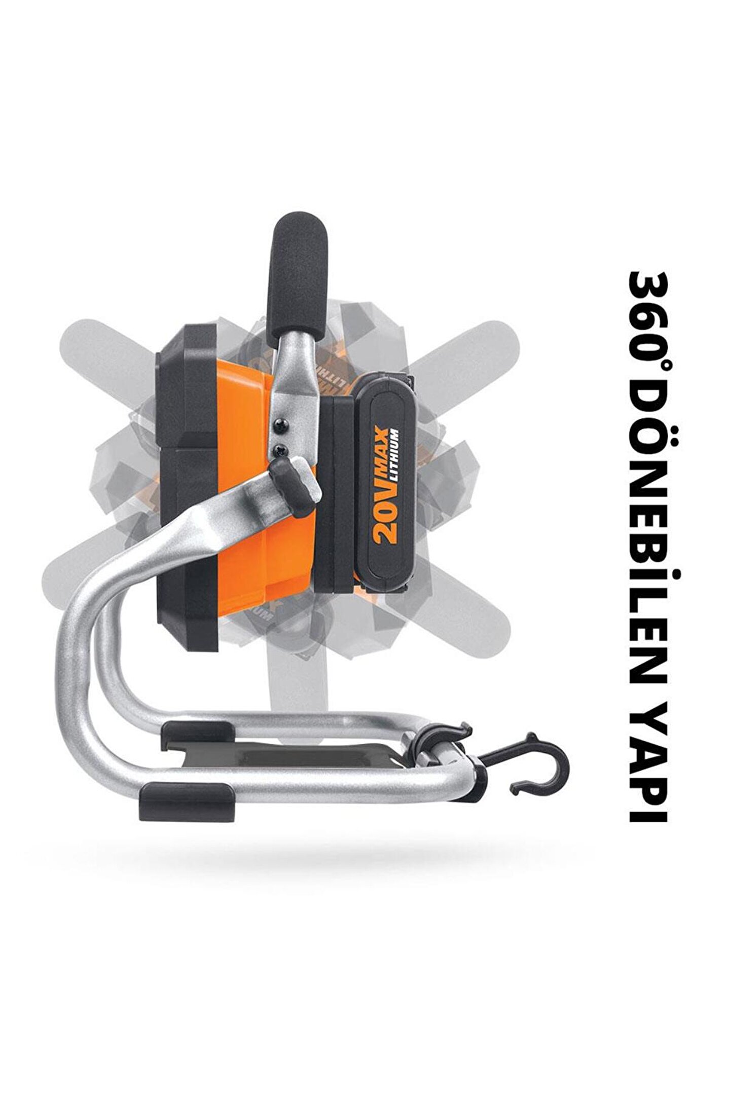 · WORX WX026.9 20Volt 1500 Lümen Profesyonel Led Projektör (Akü Dahil Değildir) · 20Volt Li-ion teknolojisi ile tüm rakiplerinden daha uzun süre ve maksimum aydınlık sağlar.; · Yüksek aydınlatma gücü sayesinde şantiye alanları, inşaat alanları, depolar, karanlıkta harita okuma, lastik değiştirme, kamp alanında aydınlatma gibi birçok alanda kullanım imkânı sağlar.; · 3 farklı kullanım şekli sayesinde asılarak, düz ve ters monte edilerek kullanılabilir parlak güçlü 1500 lümen LED aydınlatma ışığı ile geniş kullanım alanı.; · 360° kendi ekseninde dönebilen ve sabitlenebilen yapısı ile istenilen açıda ve yönde aydınlatma imkânı sağlar.; · 20Volt 20Watt gücünde LED projektör ve sağlam alüminyum soğutma gövdesi çalışma esnasında halojen, akkor veya Xenon lambalardan daha az ısınarak uzun süre sorunsuz çalışma sağlar, · Dahili ayarlanabilir kancalı askılık ile aydınlatma açısı ayarlanıp sıkıştırarak kolay ve hızlı kurulum imkânı sağlar.; · Silikon kaplama açma kapatma tuşu ile dış ortam şartlarında mükemmel dayanıklılık ve koruma sağlar.; · Darbe ve düşmelere karşı dayanıklı sağlam ABS Plastik yapı.; · Worx POWER SHARE Li-ion akü teknolojisi sayesinde 20Volt Worx akünüzle tüm 20Volt Worx şarjlı ürünlerini çalıştırabilirsiniz.; 20Volt Worx akünüzle yüzlerce Worx şarjlı ürününü çalıştırabilirsiniz.; · Worx POWER SHARE Li-ion akü teknolojisi sayesinde 20Volt WORX akünüzü tüm 20V/40V/80V Worx akülü makineleriniz ile kullanabilirsiniz.; Ayrıca 40V/80V ürünlerinizle birlikte gelen akülerinizi tüm 20V Worx akülü makinalarınız ile kullanabilirsiniz.; · Akü ve Şarj cihazı hariç satılan tüm Worx ürünlerinde, amper değeri gözetmeksizin istediğiniz 20Volt WORX aküyü satın alarak ürününüzü kullanabilirsiniz.; · Son derece kompakt ve hafif tasarımı ile kolay taşıma imkânı.; · Taşıma kolu üzerine entegre sünger kaplama sayesinde konforlu kullanım sağlar.; · Daha fazla çalışma süresi için sağlam LED aydınlatma teknolojisi.; · Kayar akü sistemi ile kolay ve güvenli akü değiştirme.; · AKÜ VE ŞARJ CİHAZI DAHİL DEĞİLDİR! · Profesyonel Kullanıma uygundur.; · Güç: 20Volt Li-ion · Işık Şiddeti: 1500 Lümen · Işık Ayar Kademesi: 1 · Döner Kafa Açısı: 360° · 2.0Ah.; Worx Akü ile kullanımda: 2 Saat · 4.0Ah.; Worx Akü ile Kullanımda: 4 Saat · Max.; Yükseklik: 27cm · Standart Ekipman: Dahili asma kancası.; · Ağırlık: 1,8 Kg.