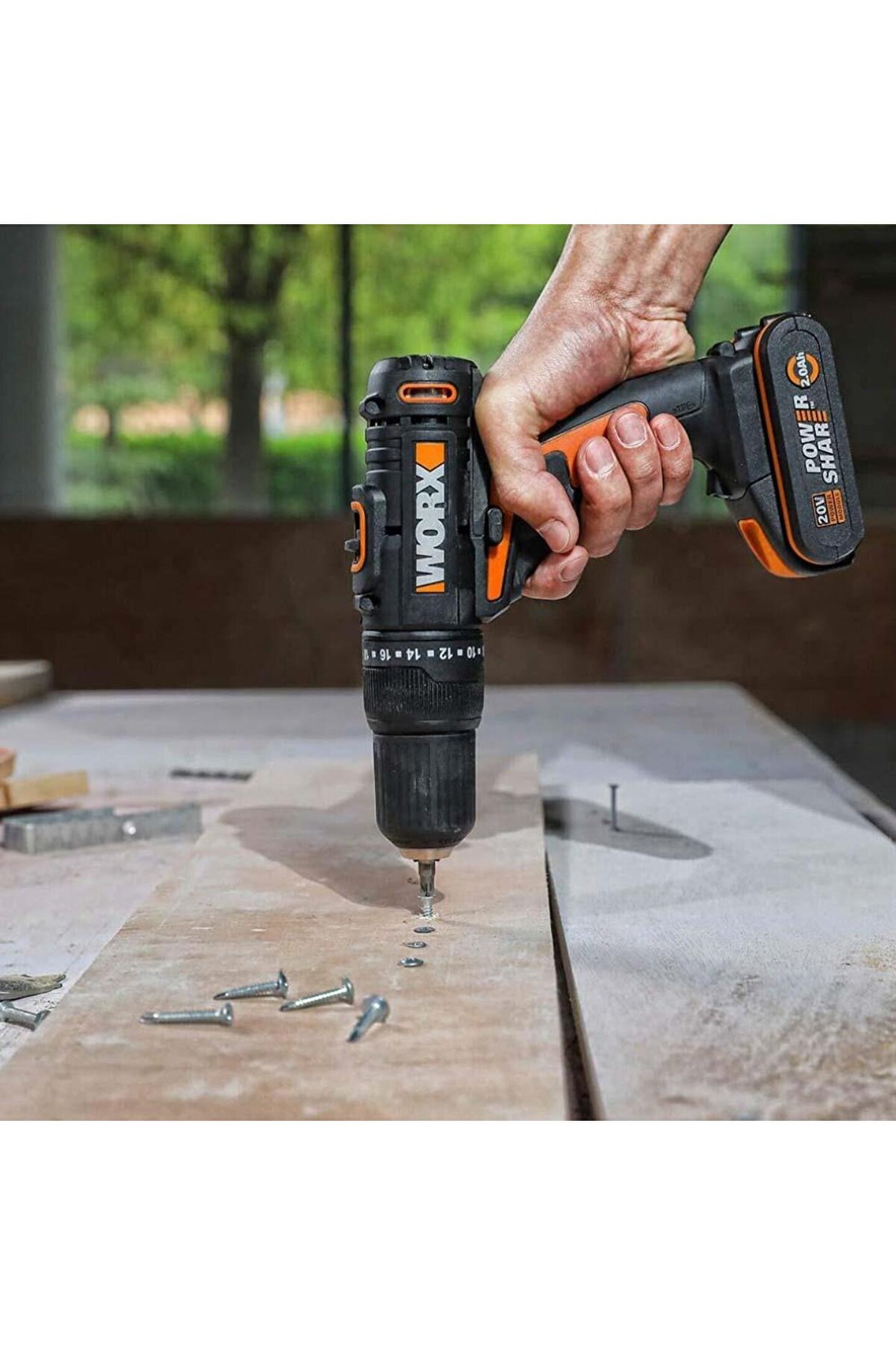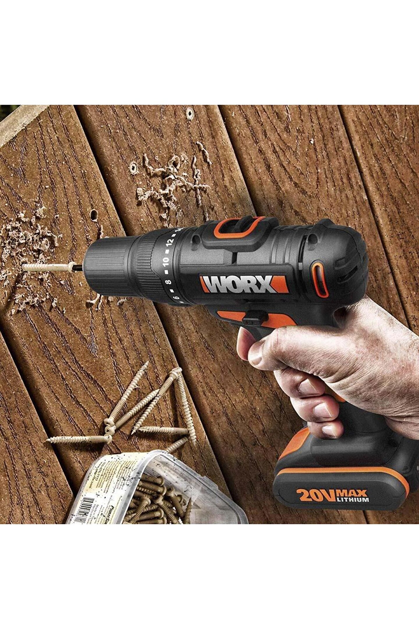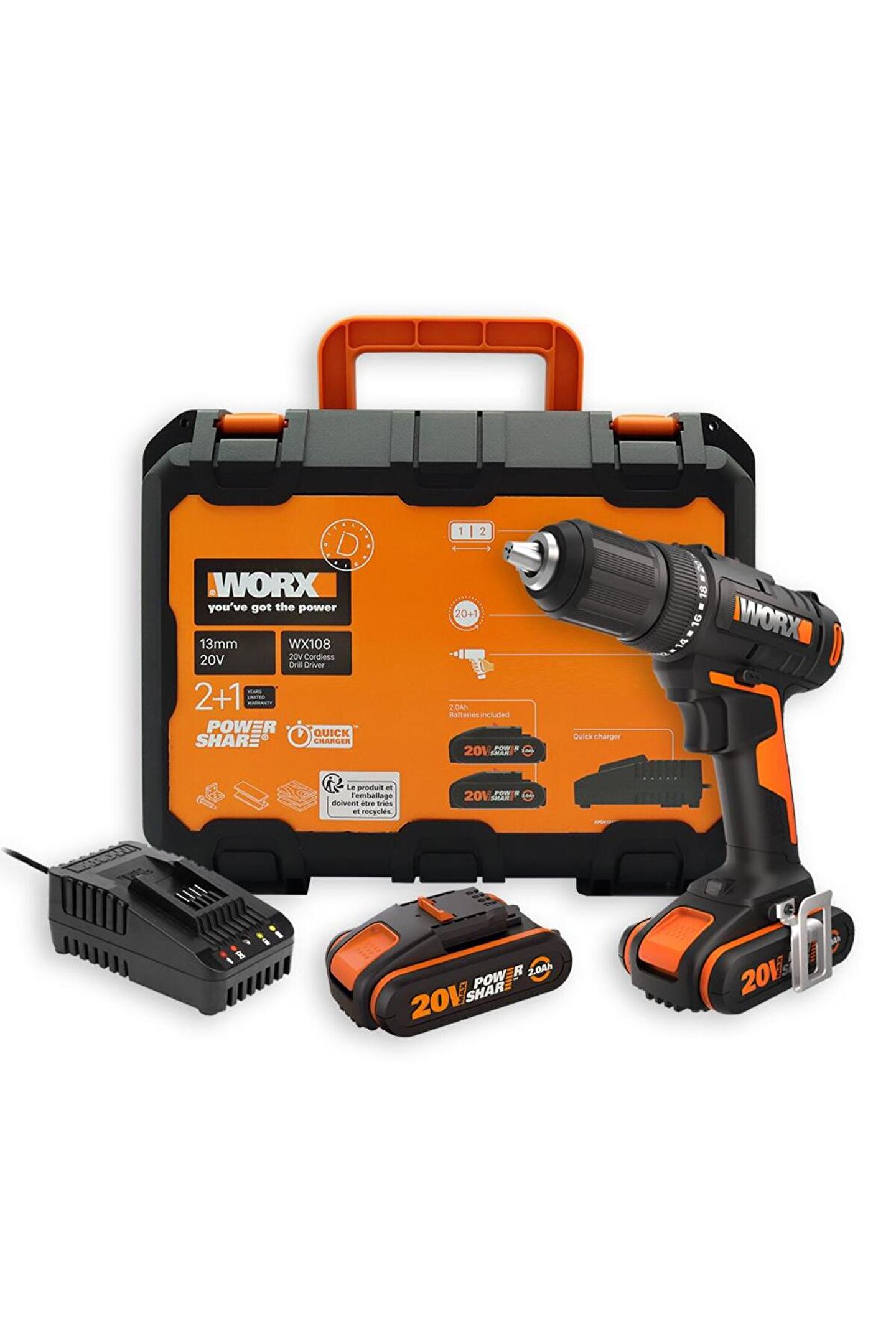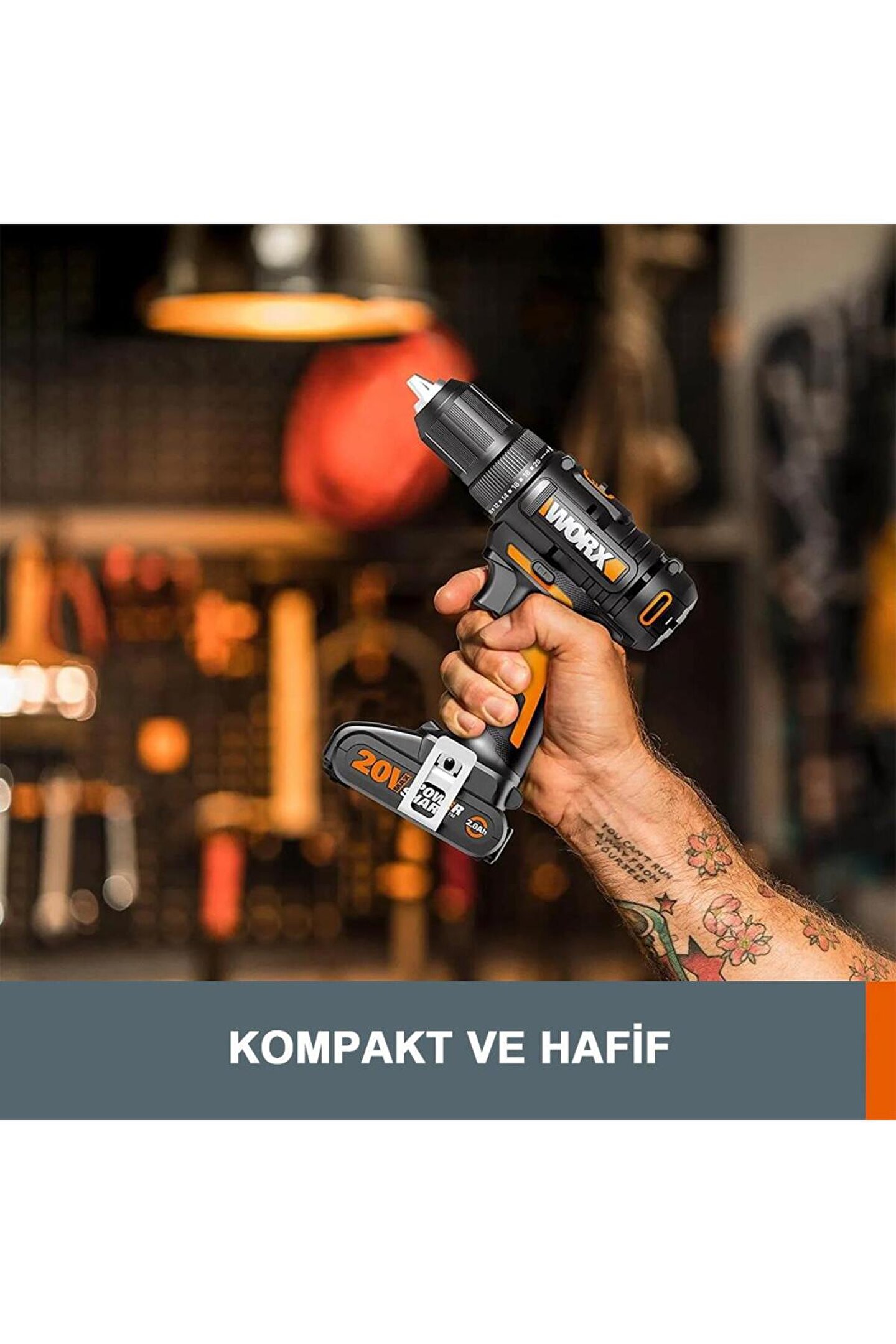 · WORX WX108 20Volt/2.0Ah.; Li-ion Çift Akülü Profesyonel Şarjlı Matkap · 20Volt Li-ion akü ve motor teknolojisi ile tüm rakiplerinden daha güçlü ve yüksek .; · Delme, Vidalama gibi tüm profesyonel işlerde kullanmak üzere tasarlanmış üstün motor teknolojisi sayesinde son derece güçlü ve sağlam şanzıman yapısı ile en zorlu uygulamalarda dahi üstün sağlar.; · Worx POWER SHARE Li-ion akü teknolojisi sayesinde 20Volt WORX akünüzü tüm 20V/40V/80V Worx akülü makineleriniz ile kullanabilirsiniz.; Ayrıca 40V/80V ürünlerinizle birlikte gelen akülerinizi tüm 20V Worx akülü makinalarınız ile kullanabilirsiniz.; · 45Nm maksimum tork gücü ve iki vitesli şanzıman sayesinde üstün güç ve ile en zorlu uygulamalarda dahi zorlanmadan delme ve vidalama yapma imkânı.; · Elektronik hız ayarı sayesinde delme ve vidalama uygulamalarında kullanılan malzemeye göre en uygun hız kontrolü · Worx Aktif Akü Koruma Teknolojisi ile aşırı zorlanmalarda ve uç sıkışması gibi durumlarda otomatik olarak akü enerjiyi durdurur ve LED ikaz ışığı yanıp söner, aküyü ve motoru korumaya alır.; Tetiğe tekrar basıldığında çalışmaya başlar.; · 2 vitesli şanzıman ile farklı malzemelerde kullanılmak için değişken hız ve sağ/sol dönüş ayarı.; · 2 vitesli şanzıman, ahşap, çelik, plastik ve metalde üstün delme ve vidalama performansı sağlar.; · Tork ayar özelliği ayarlanan tork gücüne ulaştığında malzemeye ve vidaya zarar vermeden otomatik olarak durmasını sağlar.; · Otomatik mil kilitli ağır hizmet tipi 10mm anahtarsız mandren ile tek elle kolay ve hızlı uç değiştirme.; · Olağanüstü kompakt ve hafif, zor alanlarda bile uzun süre yorulmadan çalışma imkânı sağlar.; · En zorlu uygulamalar için 20 kademeli tork ayarı.; · Geri dönüşte tam güç sağlayan özel teknoloji sayesinde vida sökmede veya sıkışan ucu çıkarmada tam güç sağlar.; · Worx 20Volt Li-ion akü kullanılmadığı zamanda şarjını korur, bu sayede istediğiniz an kullanıma hazırdır.; · Rahat kullanım için titreşimi emen kauçuk kaplı tutma kolu · Entegre LED aydınlatma çalışma alanını aydınlatır.; · Taşıma çantası ile alet ve aksesuarları temiz ve güvenli bir şekilde saklama · Profesyonel Kullanıma uygundur.; · Akü Kapasitesi: 2.0Ah.; Li-ion · Maks.; Tork: 45 Nm · Tork Ayarı: 20+1 · Yüksüz Hızı: 0-400/0-1600 dev/dk.; · Maksimum Delme Kapasitesi: Metal: 13mm, Ahşap: 40mm · Mandren Kapasitesi: 10mm · Ağırlık: 1,33 Kg.; · Standart Ekipman: 2 Adet 20Volt 2.0Ah.; Akü, 1 Saatlik Akü Şarj Cihazı, Çift başlı vidalama Ucu, kemer Askı Kancası, Ağır Hizmet Tipi Taşıma Çantası
