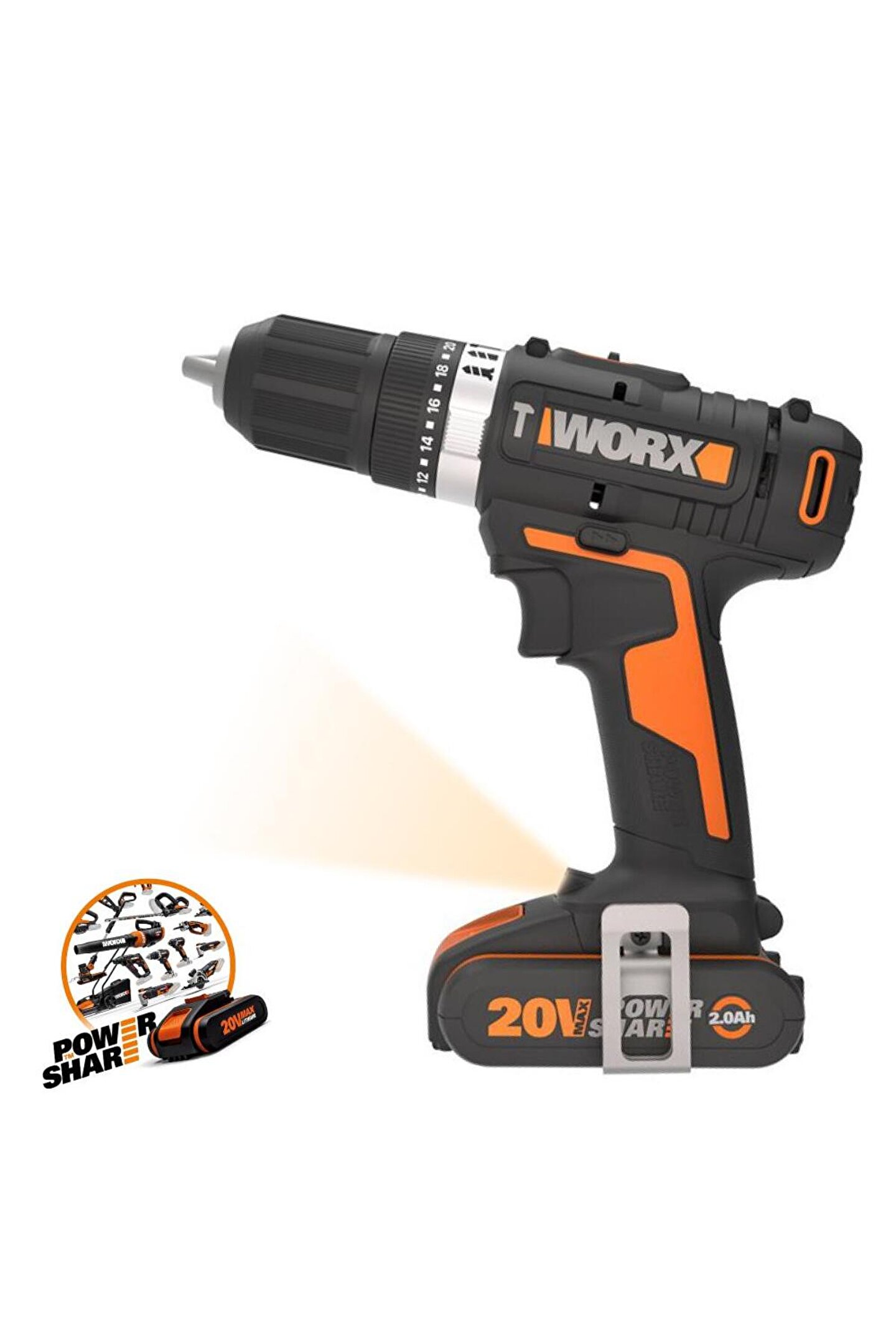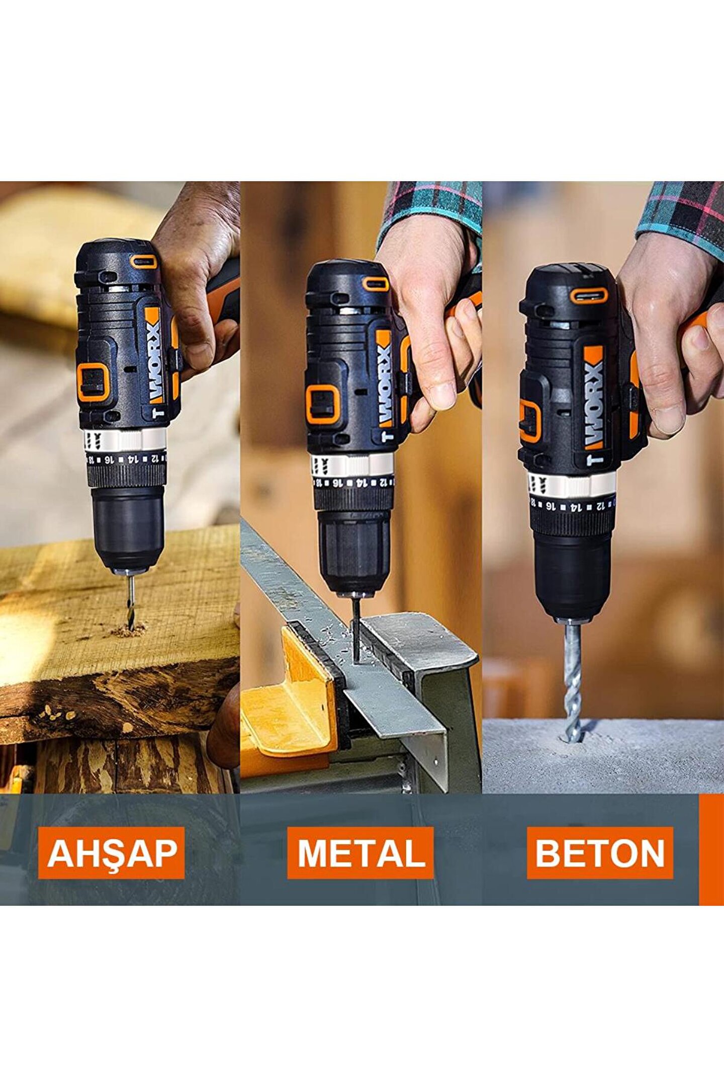 · WORX WX370.1 20Volt/2.0Ah.; Li-ion Çift Akülü Profesyonel Şarjlı Darbeli Matkap · 20Volt Li-ion akü ve motor teknolojisi ile tüm rakiplerinden daha güçlü ve yüksek .; · Worx darbe teknolojisi ve yüksek darbe gücü ile duvarda sorunsuz mükemmel delme performansı sağlar.; · Worx POWER SHARE Li-ion akü teknolojisi sayesinde 20Volt Worx akünüzle tüm 20Volt Worx şarjlı ürünlerini çalıştırabilirsiniz.; 20Volt Worx akünüzle yüzlerce Worx şarjlı ürününü çalıştırabilirsiniz.; · Worx POWER SHARE Li-ion akü teknolojisi sayesinde 20Volt WORX akünüzü tüm 20V/40V/80V Worx akülü makineleriniz ile kullanabilirsiniz.; Ayrıca 40V/80V ürünlerinizle birlikte gelen akülerinizi tüm 20V Worx akülü makinalarınız ile kullanabilirsiniz.; · 50Nm maksimum tork gücü ve iki vitesli şanzıman sayesinde üstün güç ve ile en zorlu uygulamalarda dahi zorlanmadan delme ve vidalama yapma imkânı.; · Elektronik hız ayarı sayesinde delme ve vidalama uygulamalarında kullanılan malzemeye göre en uygun hız kontrolü.; · Worx Aktif Akü Koruma Teknolojisi ile aşırı zorlanmalarda ve uç sıkışması gibi durumlarda otomatik olarak akü enerjiyi durdurur ve LED ikaz ışığı yanıp söner, aküyü ve motoru korumaya alır.; Tetiğe tekrar basıldığında çalışmaya başlar.; · 2 vitesli şanzıman, duvar, ahşap, beton, çelik, plastik ve metalde üstün delme ve vidalama performansı sağlar.; · Tork ayar özelliği ayarlanan tork gücüne ulaştığında malzemeye ve vidaya zarar vermeden otomatik olarak durmasını sağlar.; · Otomatik mil kilitli ağır hizmet tipi 13mm tek kovanlı anahtarsız metal mandren ile tek elle kolay ve hızlı uç değiştirme.; · Kompakt tasarım tek elle rahat kullanım ve dar alanlara erişim sağlar.; · En zorlu uygulamalar için 20 kademeli tork ayarı.; · Vidalama için ve darbeli delme fonksiyonları için birbirinden bağımsız tork ayar bileziği sayesinde uzun şanzıman ömrü.; · Sağ/sol ayarı ile rahat vidalama ve delme işlemi yapmanızı sağlar.; · Geri dönüşte tam güç sağlayan özel teknoloji sayesinde vida sökmede veya sıkışan ucu çıkarmada tam güç sağlar.; · Worx 20Volt Li-ion akü kullanılmadığı zamanda şarjını korur, bu sayede istediğiniz an kullanıma hazırdır.; · Worx 20Volt Li-ion akü sıradan akülere göre 4 kat daha uzun süre şarjını muhafaza eder.; · Rahat kullanım için titreşimi emen kauçuk kaplı tutma kolu · Çift Akü sayesinde şarj süresini beklemeden kesintisiz çalışma · Entegre LED aydınlatma çalışma alanını aydınlatır.; · Bez taşıma çantası ile alet ve aksesuarlarınızı temiz ve toplu bir şekilde muhafaza etme imkânı.; · Profesyonel Kullanıma uygundur · Güç: 20Volt · Akü Kapasitesi: 2.0Ah.; Li-ion · Maks.; Tork: 50 Nm · Tork Ayarı: 20+1+1 · Yüksüz Hızı: 0-400/0-1600 dev/dk.; · Darbe Sayısı: 0-6.800/0-27.200 darbe/dk.; · Maksimum Delme Kapasitesi: Tuğla: 13mm, Metal: 13mm, Ahşap 40mm · Mandren Kapasitesi: 13mm · Ağırlık: 1,35 Kg · Standart Ekipman: 2 Adet 20Volt 2.0Ah.; Li-ion Akü, Akü Şarj Cihazı, Kemer Askı Kancası, 1 Ad.; Çift Taraflı Vidalama Ucu, Bez taşıma çantası.