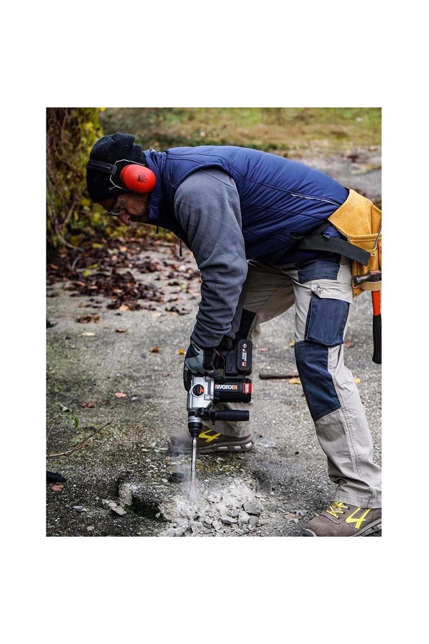 · WORX WX380.9C 20Volt 2.0Ah.; 2.2J Li-ion Tek Akülü Şarjlı Profesyonel SDS-Plus Pnömatik Kırıcı/Delici · 20Volt Li-ion akü ve kömürsüz motor teknolojisi ile tüm rakiplerinden daha güçlü ve yüksek performans.; · Delme, Vidalama gibi tüm profesyonel işlerde kullanmak üzere tasarlanmış kömürsüz motor teknolojisi sayesinde son derece güçlü ve sağlam şanzıman yapısı ile en zorlu uygulamalarda dahi üstün performans sağlar.; · Worx POWER SHARE Li-ion akü teknolojisi sayesinde 20Volt Worx akünüzle tüm 20Volt Worx şarjlı ürünlerini çalıştırabilirsiniz.; 20Volt Worx akünüzle yüzlerce Worx şarjlı ürününü çalıştırabilirsiniz.; · Worx POWER SHARE Li-ion akü teknolojisi sayesinde 20Volt WORX akünüzü tüm 20V/40V/80V Worx akülü makineleriniz ile kullanabilirsiniz.; · Worx Kömürsüz motor teknolojisi %50 daha uzun çalışma süresi ve %25 daha fazla güç sağlar.; · Tüm uygulamalar için üç farklı çalışma modu ile darbesiz delme, darbeli delme ve kırma özelliği sayesinde çok yönlü kullanım imkânı, · 2.2 Joule darbe gücü ile taş, tuğla, seramik ve betonda darbeli delme ve kırma için uygundur.; · 5400 Dar/dk.; İle sınıfının en seri darbe hızına sahiptir.; · Worx Aktif Akü Koruma Teknolojisi ile aşırı zorlanmalarda ve uç sıkışması gibi durumlarda otomatik olarak akü enerjiyi durdurur ve LED ikaz ışığı yanıp söner, aküyü ve motoru korumaya alır.; · Akü üzerinde yer alan akü şarj seviyesini gösteren LED lamba sayesinde akü enerji seviyesini görebilme imkânı.; · Emniyet debriyajı sayesinde uç sıkışmasında ortaya çıkabilecek yüksek torku sönümleyerek kullanıcı güvenliğini maksimum seviyede tutar.; · Pnömatik mekanizma ile daha yüksek darbe gücü ve sert malzemede yüksek performans.; · Yalıtımlı Pnömatik mekanizma tozun darbe mekanizmasına girmesini önleyerek uzun süreli çalışma ve yüksek performans sağlar.; · Darbesiz Delme özelliği sayesinde ahşap ve metalde delme ve vidalama.; · Alüminyum sağlam gövde yapısı ile yalıtımlı Pnömatik mekanizma tozun darbe mekanizmasına girmesini önleyerek uzun süreli çalışma ve yüksek performans sağlar.; · Yüksek mukavemete sahip alüminyum gövdesi sayesinde düşmelere karşı üstün koruma sağlarken aşırı ısınmayı geciktirir hızlı soğutma sağlar.; · Daha fazla çalışma süresi ve uzun alet ömrü için güçlendirilmiş darbe mekanizması ve şanzıman dişlisi sayesinde kırma/delme gibi zorlu uygulamaların üstesinden kolaylıkla gelir.; · Beton ve taşta 24mm çapa kadar bağlantı delikleri delmek için uygun özel dişli ve darbe mekanizması sayesinde uzun süre kullanım imkânı.; · Yüksek hassasiyetli elektronik tetik ile uygulama yüzeylerine göre devir ayarını parmak hareketi ile kolayca ayarlayabilme kolaylığı sağlar.; · Maksimum delme kapasitesi: Beton: 24mm, Metal: 13mm, Ahşap 27mm · 1 saatlik hızlı şarj ile kesintisiz çalışma imkânı.; · Güç: 20Volt · Akü Kapasitesi: 2Ah.; Li-ion · Yüksüz hızı 0-1210 dev/dk.; · Darbe oranı 0-5400 darbe/dk.; · Tek darbe gücü 2.2 Joule · Ağırlık: 3,1 Kg · Standart Ekipman: 1 Adet 20Volt 2.0Ah.; Li-ion Akü, 1 Saatlik Hızlı Şarj Cihazı, Derinlik Çubuğu, Ayarlanabilir Yan Tutma Kolu, 8mm/10mm/12mm Beton Delme Ucu.