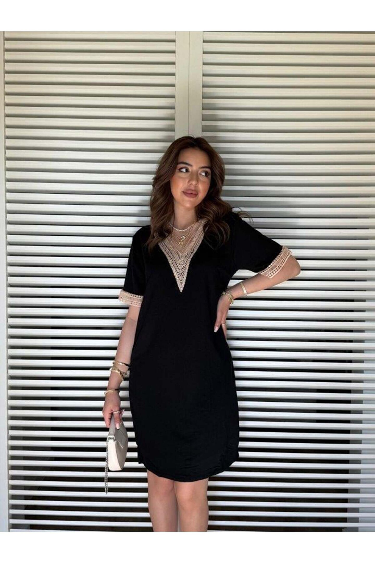 Kadın V Yaka Güpürlü İki İplik Elbise