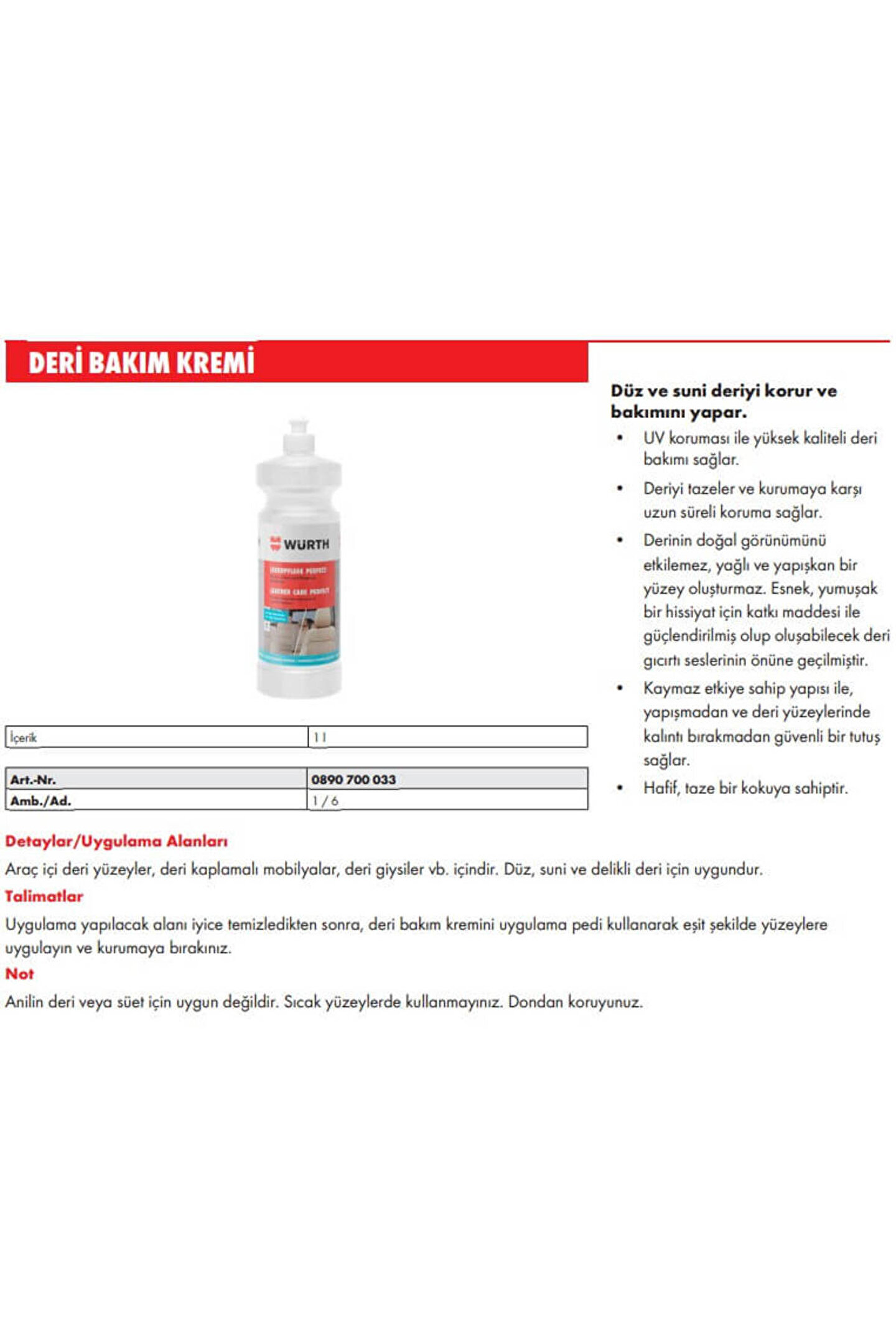 Würth Deri Besleyici Bakım Kremi Solventsiz 1000 ml Tüm pürüzsüz derilerde yüzey kalitesini koruyarak temizler ve uzun süreli bakım sağlar Silikon içermez Kullanım talimatları, yürüttüğümüz testlere ve deneyimimize dayanmaktadır; her uygulamadan önce kendi testlerinizi yapın.; Çok sayıda uygulamadan ve depolama ve işleme koşulundan dolayı belirli bir uygulama sonucu için sorumluluk kabul etmeyiz.; Ücretsiz müşteri hizmetimiz teknik bilgi sağladığı ya da bir danışma hizmeti olarak hareket ettiği ölçüde, sağlanan danışma veya servisin, belirli, sözleşmeye bağlı olarak anlaşmaya varılmış hizmetimizin kapsamı içine girmedikçe ya da danışman kasıtlı olarak davranmadıkça bu hizmet, herhangi bir sorumluluk kabul edilmeden sağlanır.; Ürünlerimizin kalitesinin sürekliliğini garanti ederiz.; Teknik değişiklikler yapma ve daha fazla geliştirme hakkımızı saklı tutarız.; Uygulama alanı Tüm pürüzsüz deriler (otomobillerdeki deri döşemeler, deri mobilyalar, ceketler vb.; ) Talimatlar Kullanmadan önce ambalajı iyice çalkalayın.; Ürünü temiz bir bez ile dairesel hareketlerle eşit bir şekilde uygulayın.; Ardından temiz bir bezle ovalayarak kurulayın.; Delikli veya taneli deriler ve tüm dokulu deri yüzeyler için bez üzerine çok ince bir tabaka ürün uygulayın.