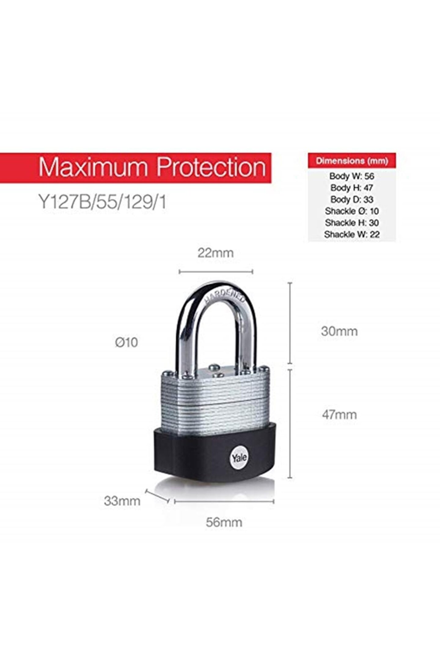 Lamine asma kilit gövdesi Çinko kaplı mat yüzey Daha yüksek güvenlik için çift bilyeli kilitleme mekanizması Sertleştirilmiş çelik boron halka 45/55mm olmak üzere farklı ihtiyaçlarınıza yönelik 2 çeşidi mevcuttur. ; Kesilme ve maymuncukla açılmaya karşı yüksek dayanım Anahtar deliği koruma mekanizması Dış mekan uygulamaları için uygun hava kosullarına dayanıklı asma kilit Dış mekanda kullanım için ideal, korozyon önleyici iç bileşenlere sahip sağlam lamine yapı. ; Halkanın kesilmesi, bükülmesi ve çekilmesi gibi farklı şekillerde saldırılara karşı EN12320:2012 standardına uygun olarak test edilmiştir. ; Ekstrem hava koşullarına karşı korumalı olduğundan emin olmak için 120 saate kadar korozyon direnci testine tabi tutulmuştur. ; Optimum performans için 10.000 çevrim (açma-kapama) uygulanmıştır. ; Yale asma kilit ambalajının kapladığı alan%10 azaltılmıştır.;