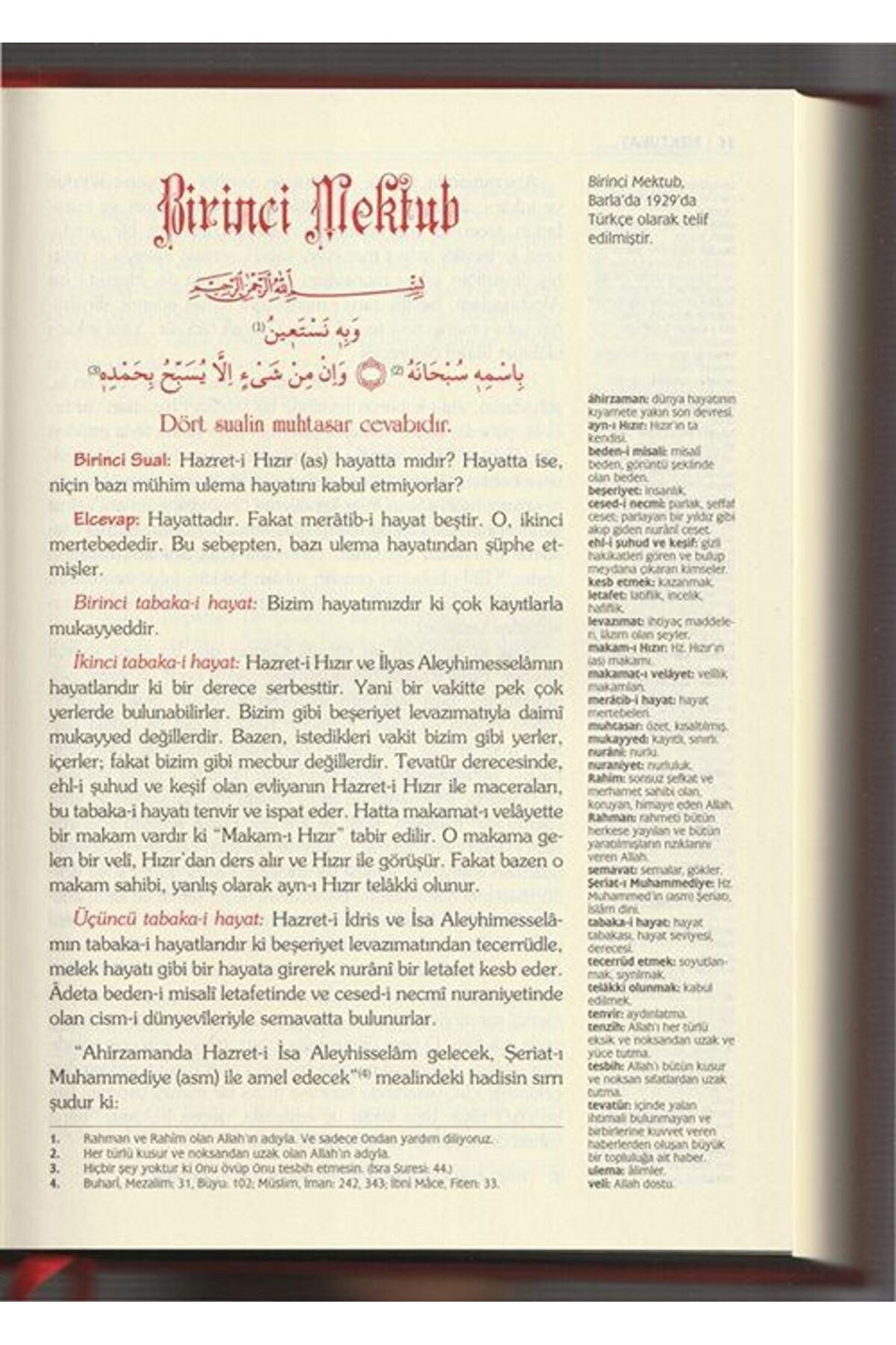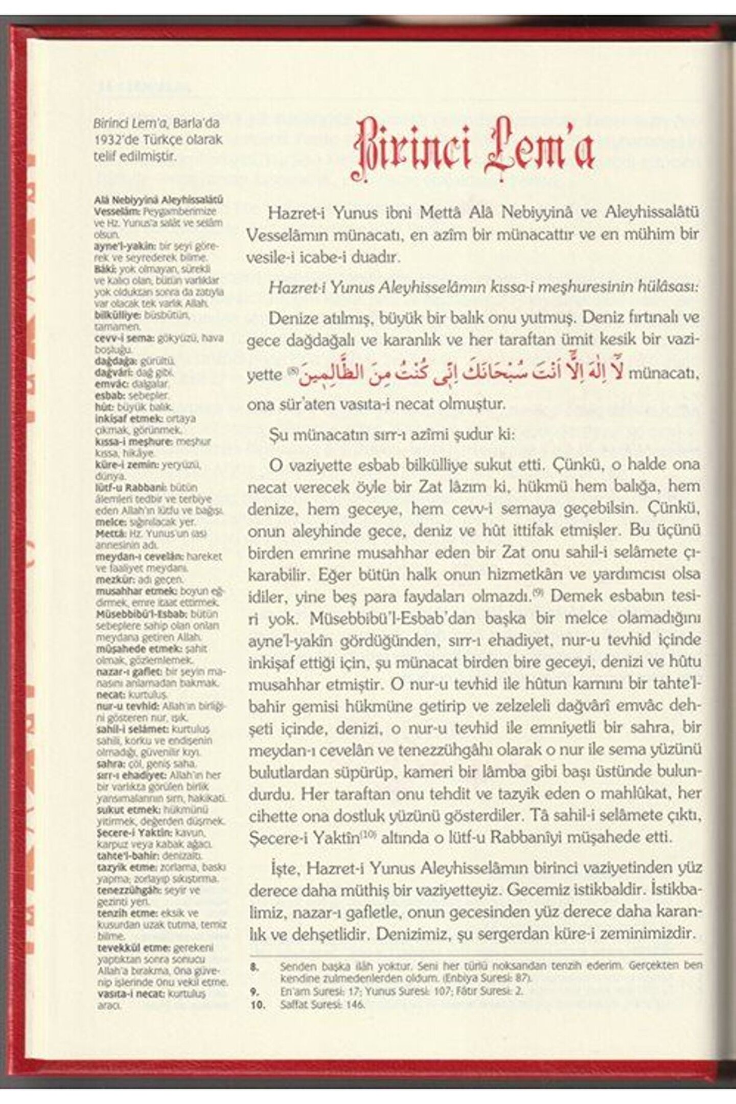 Risalei Nur Külliyatı En Çok Okunan 3 Kitap Sözler, Lemalar, Mektubat Set Yeni Tanzim-Büyük Boy-Sayfa içi lügatçeli-indexli-Ivory kağıt- Bediüzzaman Said Nursi / Yeni Asya Neşriyat Basım Yılı: 2020; Baskı: 1; Sayfa Sayısı: 2528; Kağıt Türü: Şamuha Kağıt; Ebat: 17 x 24; Dil: Arapça, Türkçe; Dil: Arapça, Türkçe; Cilt Durumu: Ciltli; Renk: Renkli; Yazar: Bediüzzaman Said Nursi; Risalei Nur Külliyatı En Çok Okunan 3 Kitap Sözler, Lemalar, Mektubat Set Yeni Tanzim-Büyük Boy-Sayfa içi lügatçeli-indexli-Ivory kağıt- Özellikler 1- Derkenar sözlük: Her sayfanın yan tarafında, cümlenin içinde geçen kelimelerin anlamları.; 2- Ayet-Hadis mealleri ve kaynakları: Geçtiği sayfanın altına konulmuştur.; 3- Arapça ve farsça metinlerin tercümeleri.; 4- Telif Tarihi: eserin yazıldığı tarih.; 5- İndeks.; Yapılan yenilikleri şu şekilde sıralayabiliriz: 1. Sayfa kenarlarında yer alan lügatçe kısmında, metinde gecen ve günlük dilde çok kullanılmaması sebebiyle ekseriyetçe bilinmediğini düşündüğümüz bazı kelimelerin manaları verilmiştir.; Bu yapılırken, kelimeye, geçtiği sayfadaki mananın verilmesine itina gösterilmiştir.; Ayrıca, bilinen lügat manasının dışında, Risale-i Nur'un orijinal üslûbu içinde kendisine has bir manada kullanılan kelime veya kelime gruplarının açıklaması da, buna uygun şekilde yapılmaya çalışılmıştır.; 2. Takdir edersiniz ki Risale-i Nur gibi, Osmanlıca kelimelerin, Arapça ve Farsça terkiplerin yoğun bir şekilde yer aldığı özel bir Kur'ân tefsirinin imlâsının Latin harfleriyle tam olarak karşılanması mümkün değildir.; Bununla beraber Risale-i Nur'un eşsiz bir dil ve üslupla Kur'ân'ın mu'cizeliğini isbat eden manevî bir tefsir olması ve sahip olduğu bu hususî lisan ile okurlarını Kur'ân'ın kudsî atmosferine dahil etmesi gibi özelliklerini dikkate alarak, rûh-u aslîyi rencide etmemek adına, eserdeki kelimeleri büyük ölçüde aslına uygun bir imla ile yazmaya gayret ettik.; Bunu yaparken de, esas olanın mana olduğunu düşünerek ve Harf İnkılâbı ile birlikte dilimiz üzerinde yaşanan menfî durumu ârizî ve geçici bir hâl kabul ederek, vasat bir yolu tutmayı ihtiyar ettik.; Büyük ölçüde kelimeleri aslına uygun yazmaya gayret etmekle birlikte, genelin ünsiyet ettiği bazı kelime yazılışlarını da, lafzı değil manayı esas almak suretiyle, günlük dilde kullanıldığı gibi bırakmayı tercih ettik.; Bu vesileyle, Risale-i Nur imlasının tam olarak yansıdığı, belki de Kuran harfli metin ile Latin harfli olanın karşılıklı sayfalarda yer aldığı bir Külliyat çalışmasını da, âlem-i İslâm'ın ortak yazısı olan Kur'an harflerini öğrenmeye yeni nesilleri teşvik edeceği düşüncesiyle, yayınevi olarak hederlerimiz arasına aldığımızı ifade etmiş olalım.; Bir ihtisas heyeti tarafından istişarelerle yürütülen bütün bu çalışmalarda bize, Risale-i Nur'da yer alan "Türk lisanının sadmeler [darbeler] geçirmesine bakılırsa, Risale-i Nur, Türkçe'de, lisan üzerinde de imam olacağı" (Emirdağ Lahikası, 59. Mektub) ifadesi ışık tutmuştur.; 3. Kitabın girişindeki "Bediüzzaman Said Nursî kimdir?" kısmında, Risale-i Nur Enstitüsü tarafından hazırlanan, müellifin kısa bir biyografisi istifadeye sunulmuştur.; 4. Kitabın sonunda yer alan indeks, konu başlıklarının yanında alt başlıkların da dikkate alındığı bir titizlikle hazırlanmıştır.; 5. Her risalenin "telif tarihi" ile ilgili olarak elde bulunan bilgiler hem o risalenin başına, hem de liste olarak eserin sonuna konulmuştur.; YENİ ASYA NEŞRİYAT