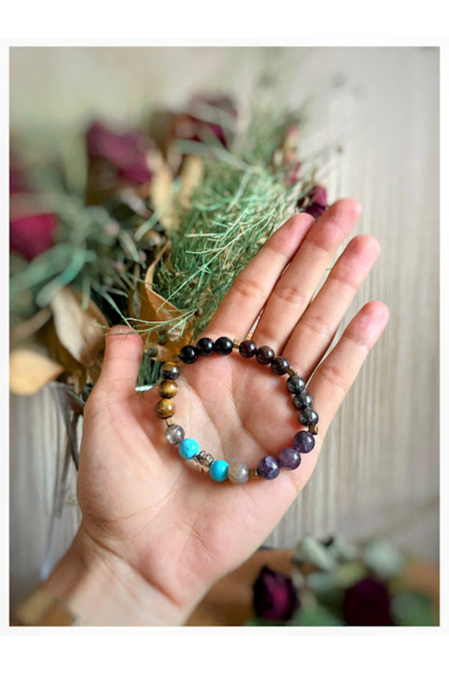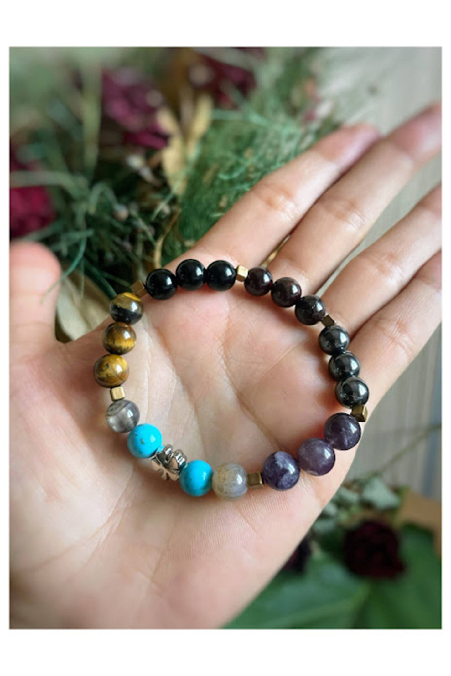 Bu üründe kullanılan doğal taş: TURKUAZ,AKİK,ONİKS,LAL,KAPLANGÖZÜ,AMETİST,HEMATİT Bu üründe kullanılan doğal taş boyutu: 8 mm Misinali İp kullanılmıştır. ; Ürün ile birlikte Yedek misinada gönderilmektedir. ; Birlikte tasarlamak istediğiniz ürün için bizimle iletişime geçebilirsiniz. ; Unutmayın, bu mağazadaki her şey size özel olacaktır. ; **ÜRÜNLERİMİZ DOĞALTAŞ OLDUĞU İÇİN RENKLERDE FARKLILIK GÖSTEREBİLİR** . ; !!! DOĞALTAŞLAR SADECE TIBBA DESTEK AMAÇLI ŞİFA NİYETİNE KULLANILMALIDIR, TEDAVİ EDİCİ DEĞİLDİ !!! ***ENERJİ-DENGE DOĞALTAŞ BİLEKLİK*** HUZUR VEREN DENGENİZİ SAĞLAYAN VE BİRÇOK AĞRILARINIZI PSİKOLOJİK OLARAK RAHATLATAN BACAKLARIMIZ İÇİN OLDUKÇA YARARLI, NAZARA İYİ GELEN, KEM GÖZLERDEN KORUYAN, SİZİ BAMBAŞKA BİRİ YAPAN MUCİZE BİLEKLİK...;