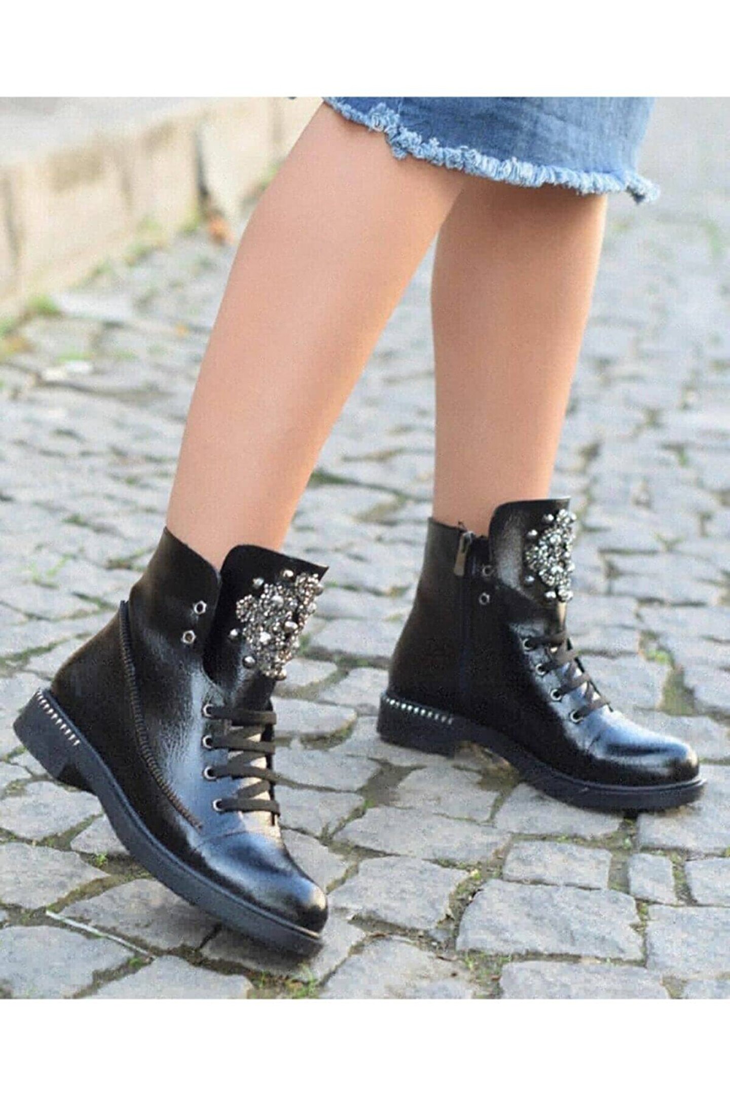 Suni deri dış materyali ile şıklığı ve dayanıklılığı bir arada sunar, uzun süreli kullanım için idealdir; Bağcıklı tasarımı sayesinde ayaklarınıza mükemmel uyum sağlar ve kişisel konforunuzu artırır; İç tabanında kullanılan tekstil materyali, ayaklarınızın gün boyu rahat etmesini sağlar; Günlük kullanım için tasarlanmış olup, hem şıklığı hem de rahatlığı bir arada sunar; 1 ila 4 cm arasındaki kısa topuk boyu ile gün içindeki konforunuzdan ödün vermeden zarif bir duruş sergiler; Kauçuk taban materyali sayesinde kaymazlık özelliği ile güvenli adımlar atmanızı sağlar; Desenli yapısıyla göz alıcı bir görünüm kazandırırken, bot kalıbı modern ve feminen çizgiler taşır; Saya materyali olarak da suni deriden üretilmiştir; böylece botunuzun estetik bütünlüğü korunurken dayanıklılık da ön planda tutulur; Düz topuklu tasarımıyla stabiliteyi arttırarak yürüyüş konforunu maksimize eder; Astar;