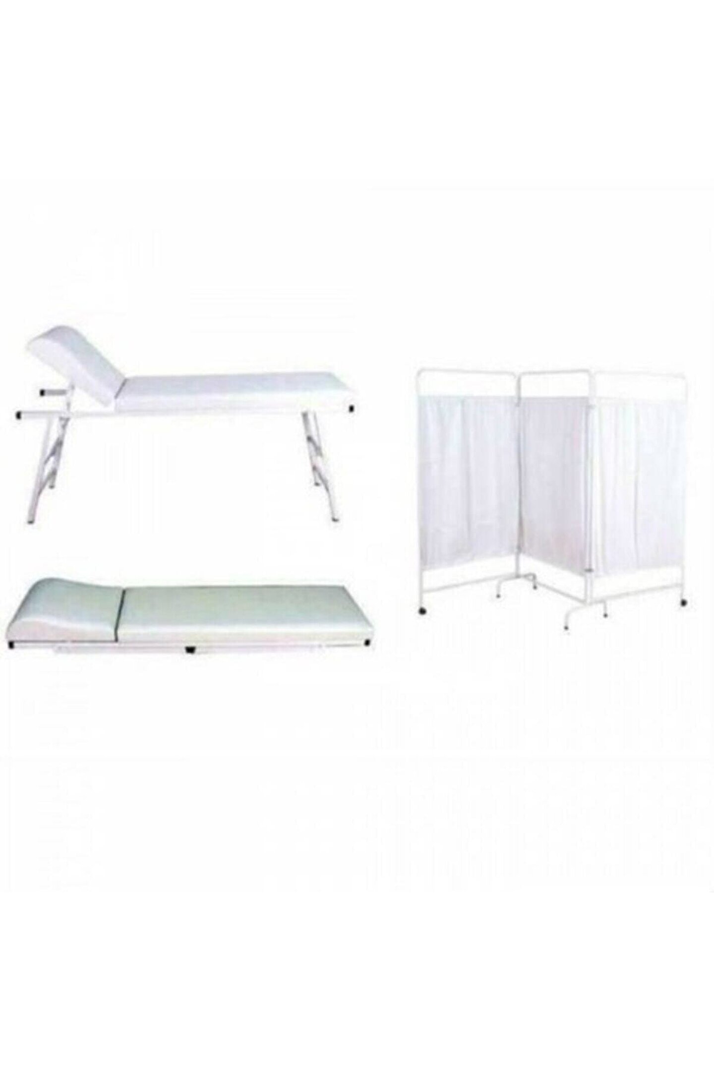 Muayene Masası 3 Katlı Paravan Birlikte ÜRÜN ÖZELLİKLERİ Katlanabilir Muayene Masası; Manuel mekanizma ile ayarlanan sırt kısmı Sünger üzeri vinlex deri kaplı yatma platformu Katlanabilen ayakları Tüm metal aksam elektrostatik toz boya 3 Katlı Katlanabilir Metal Paravan; 1.Resimde görüldüğü üzere 3 kanatlıdır. 2.Yan kanatların rahat bir şekilde hareket edebilmesi için tekerlekleri bulunmaktadır. 3.Metal kısımlar elektro statik toz boya ile boyanmıştır. 4.Bezli şekilde gönderilir. 5.Bezleri sökülüp takılabilir. 6.Sabit ayak profillerinin yere temas eden kısımlarında plastik pabuç bulunmaktadır. Muayene Masası; ÖLÇÜLERİ : En: 60 cm - Boy: 184 cm - Yükseklik: 73 cm