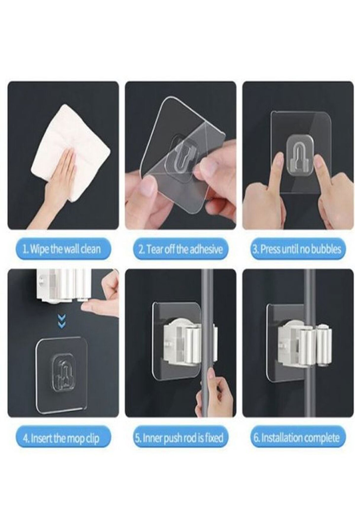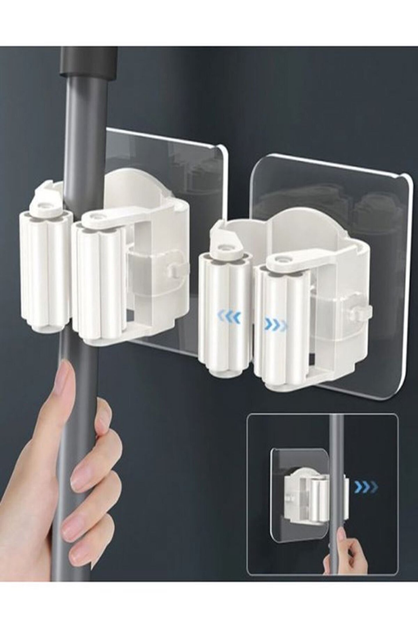 Süpürge, paspas, temizleme fırçası, şemsiye ve saplı diğer ürünleri asmak için kullanılabilir. ; Banyonuzu temiz ve düzenli tutun, yerden tasarruf edin. ; Kolayca düşmeden duvara yapışması kolaydır. ; Kurulumu kolay: sadece kendinden yapışkanlı ped filmini soyun ve pürüzsüz duvar yüzeyine yapıştırın, ardından birkaç saniye basın. ; Pürüzsüz ve kuru bir yüzeye yapıştırın. ; Paket içeriği: 4 Adet Yapışkanlı Pratik Mop Tutucu;