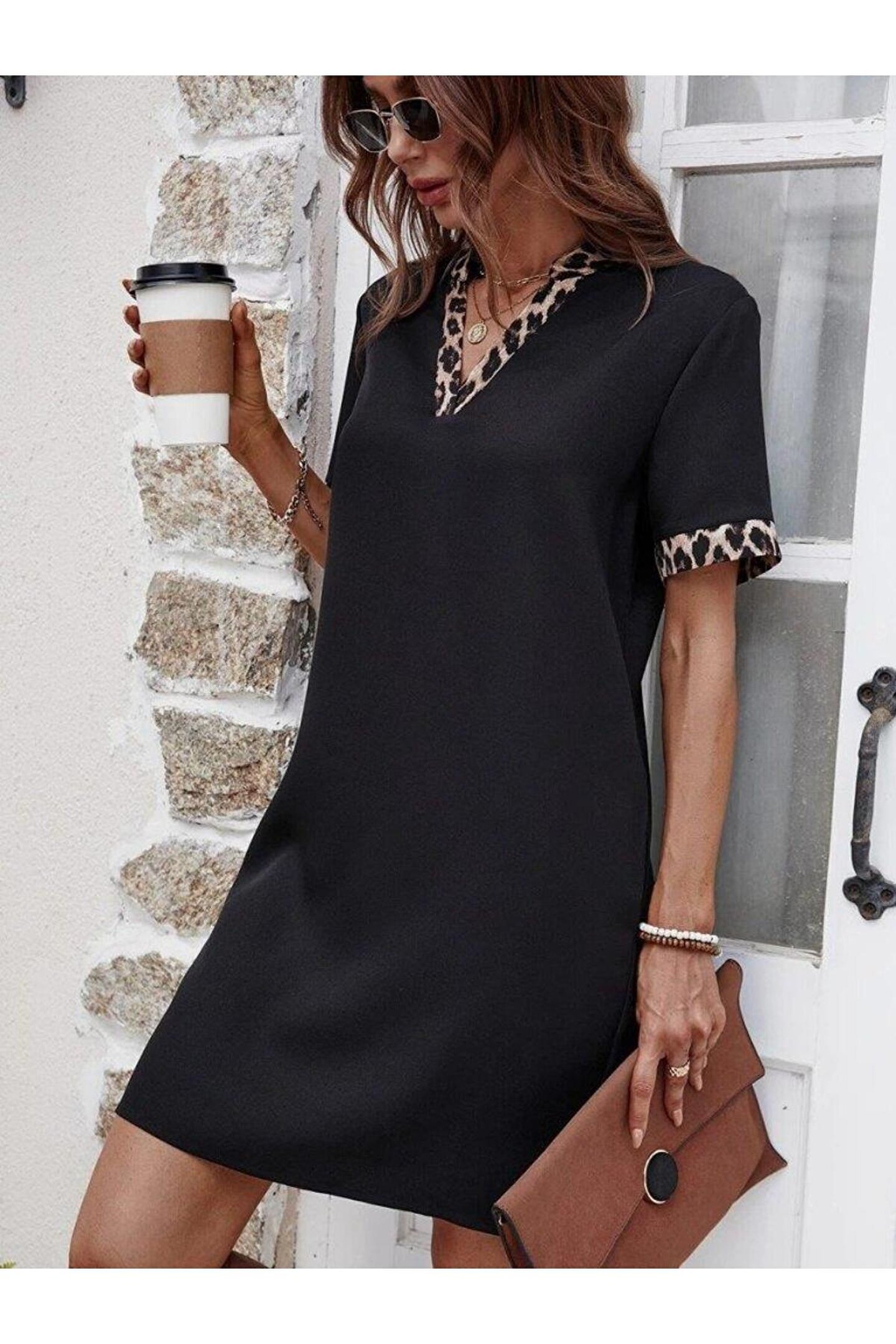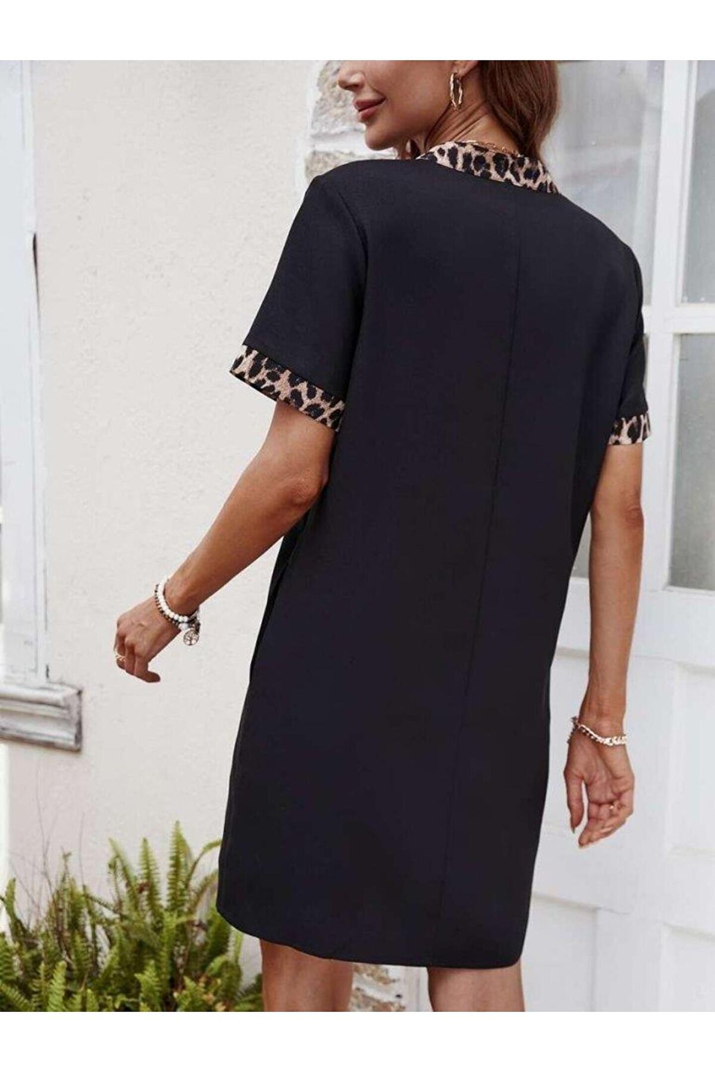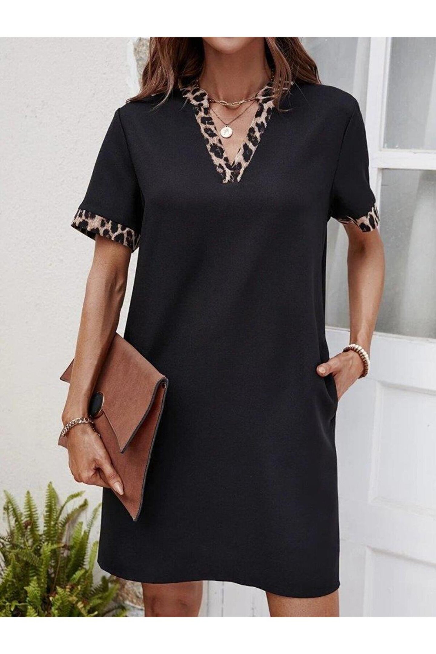 YOMNA Kadın Kısa Kollu V Yakalı Leopar Desen Detaylı Modal Elbise