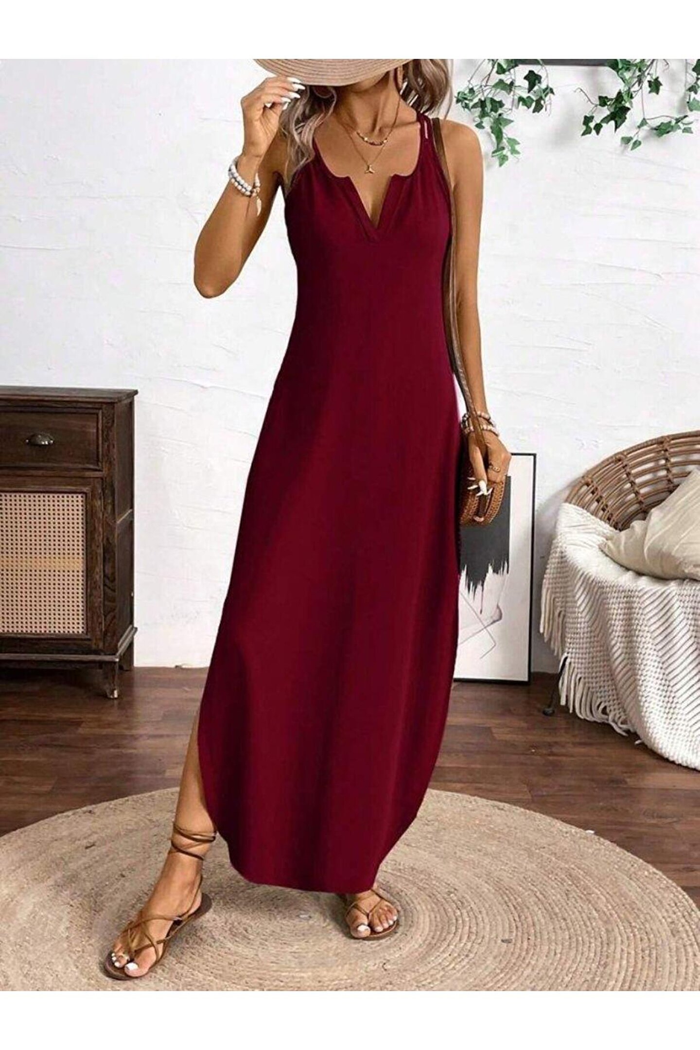 yonca aksesuar Kadın Askılı Yuvarlak Yaka Asimetrik Detaylı Viskon Elbise