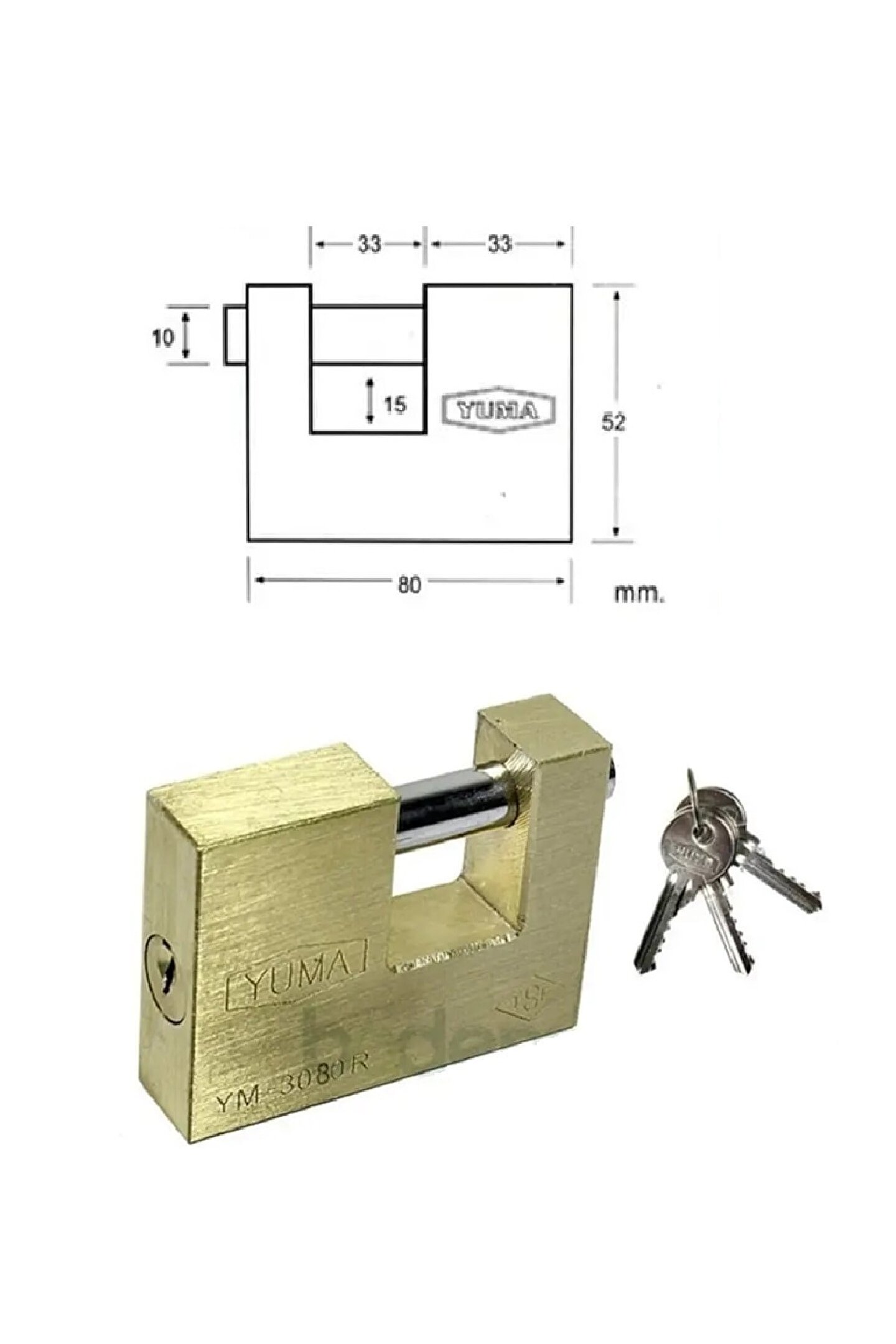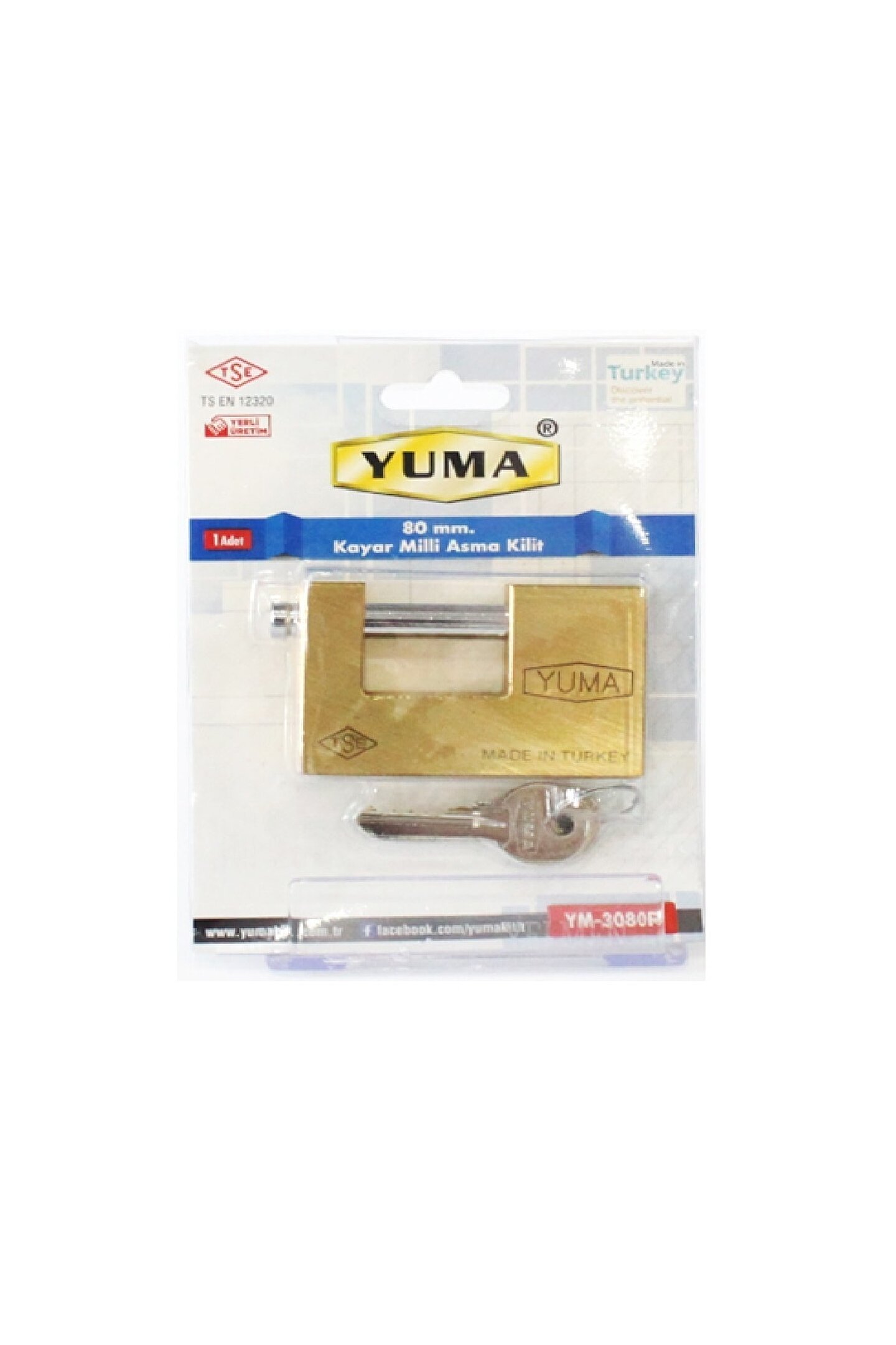 YUMA 80 mm KAYAR MİLLİ ASMA KİLİT ÜRÜN MODELİ: YM-3080R Darbe, paslanma ve çürümelere karşı dayanıklı MS 58 pirinç/çelik gövde ve pirinç silindir. Çekiçle darbeye ve koparmaya dayanıklı kanca kilitleme mekanizması Standart krom kaplama çelik kanca Paslanmaz yaylar TS EN 12320 standardında TSE belgeli Opsiyonel Pass veya Master sistem