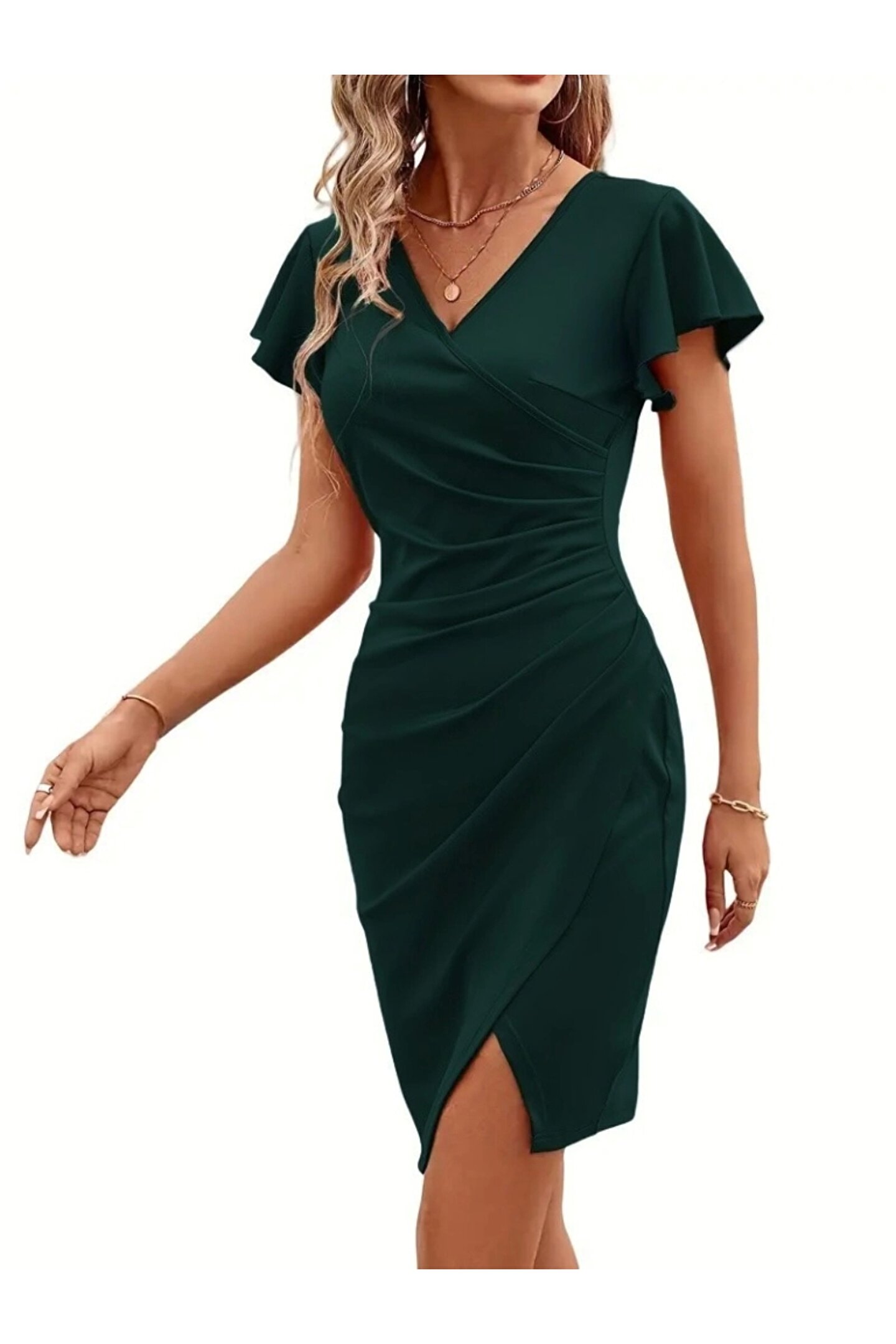 ZAGA Prime Kadın Kısa Kollu Volanlı Kruvaze Yaka Yanlardan Büzgülü Ithal Krep Elbise