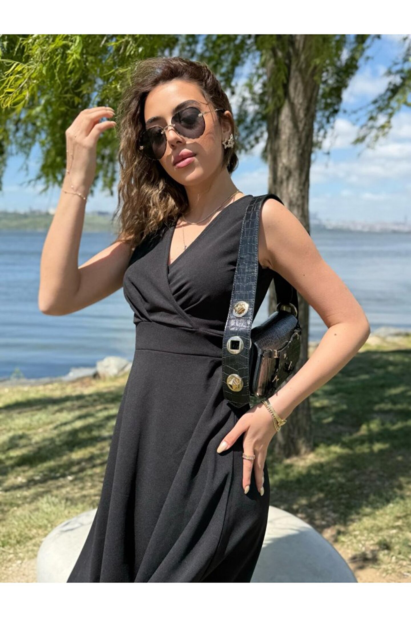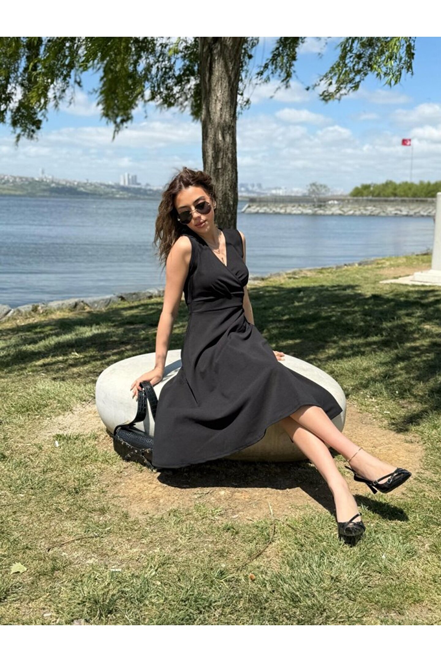 Kadın Ithal Krep Kumaş Kruvaze Yaka Eteği Kloş Kolsuz Mini Elbise