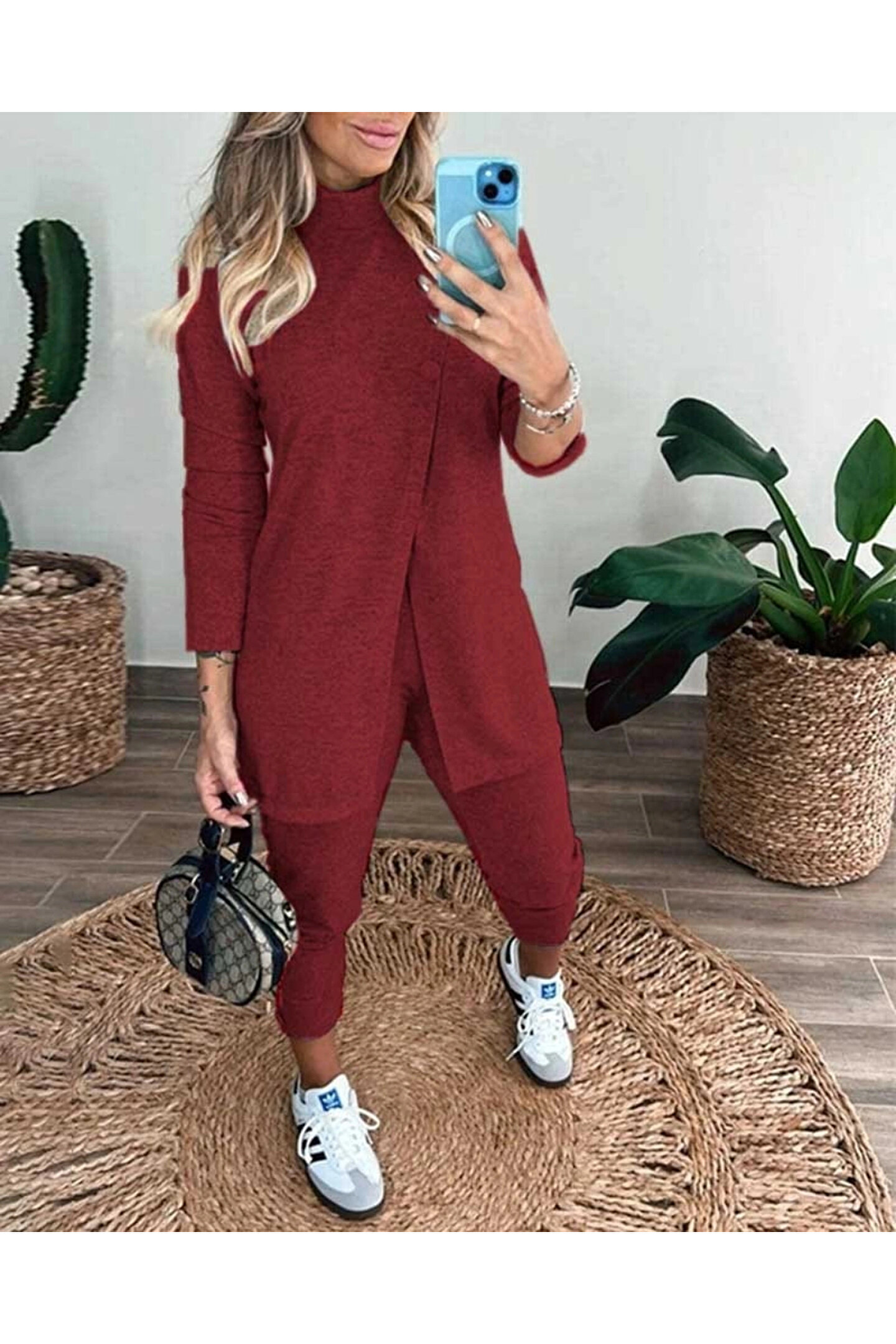 ZenWave Kadın Uzun Kollu Balıkçı Yaka önden Düğmeli Bluz Ve Pantolon Yumoş Ikili Takım