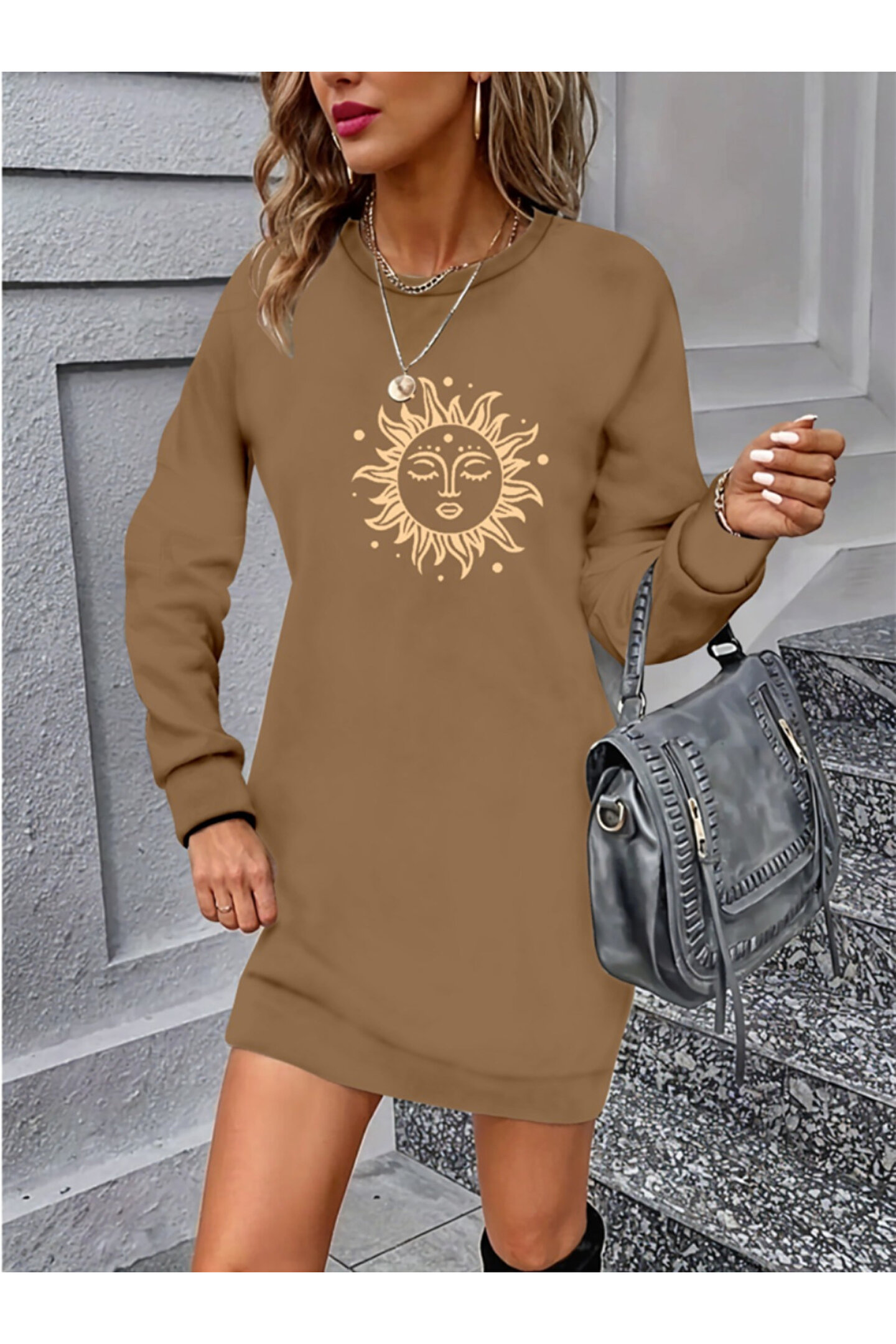 ZenWave munn collection Kadın Uzun Kollu Bisiklet Yaka Güneş Desenli Viskon Iki Iplik Elbise